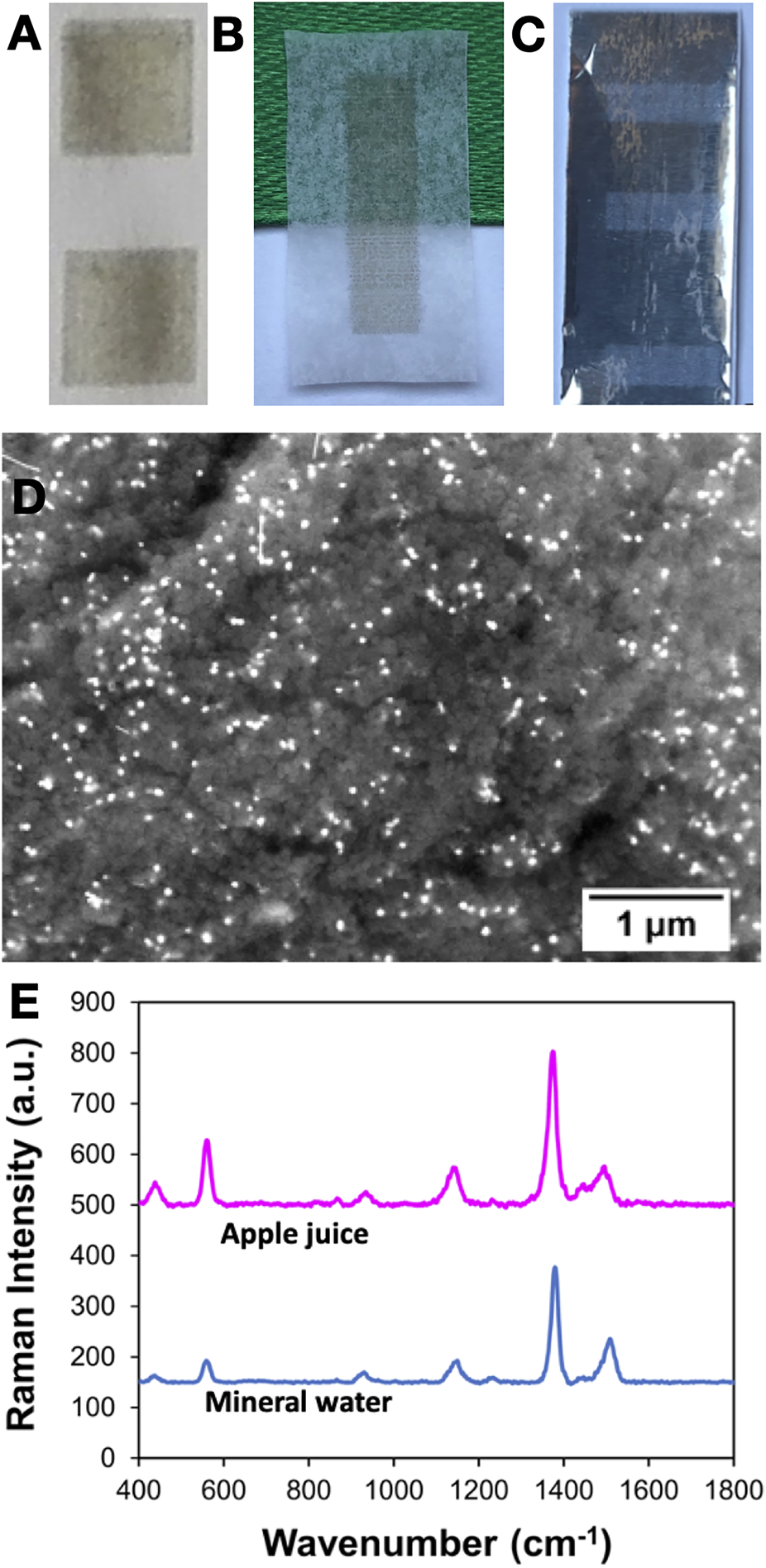SERS substrates prepared by inkjet printing of metal colloids on different types of paper: (A) Ag/PS on office paper; (B) Ag on parchment paper (C) Au/PS on aluminium foil paper; (D) SEM image of office paper printed with Ag/PS ink, showing the metal NPs as white spots on a polymeric background.; (E) SERS spectra of thiram (10−6 M) spiked in apple juice and mineral water using Ag/PS as the substrate.