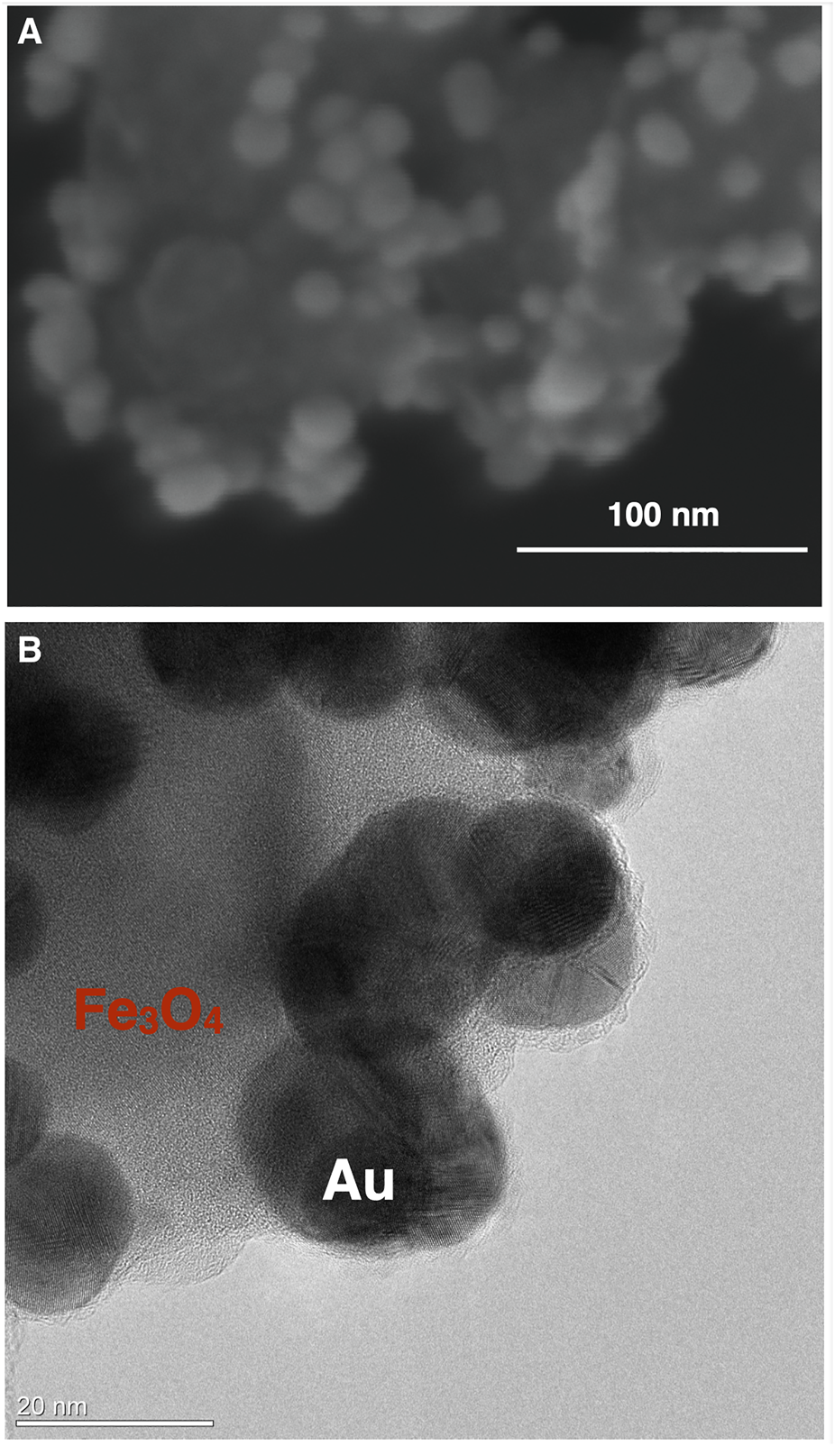 Electron microscopy images of multifunctional magneto-plasmonic nanosorbents: SEM (A) and TEM (B) images. The magnetic drivers are Fe3O4 particles decorated with SERS active Au nanoparticles.