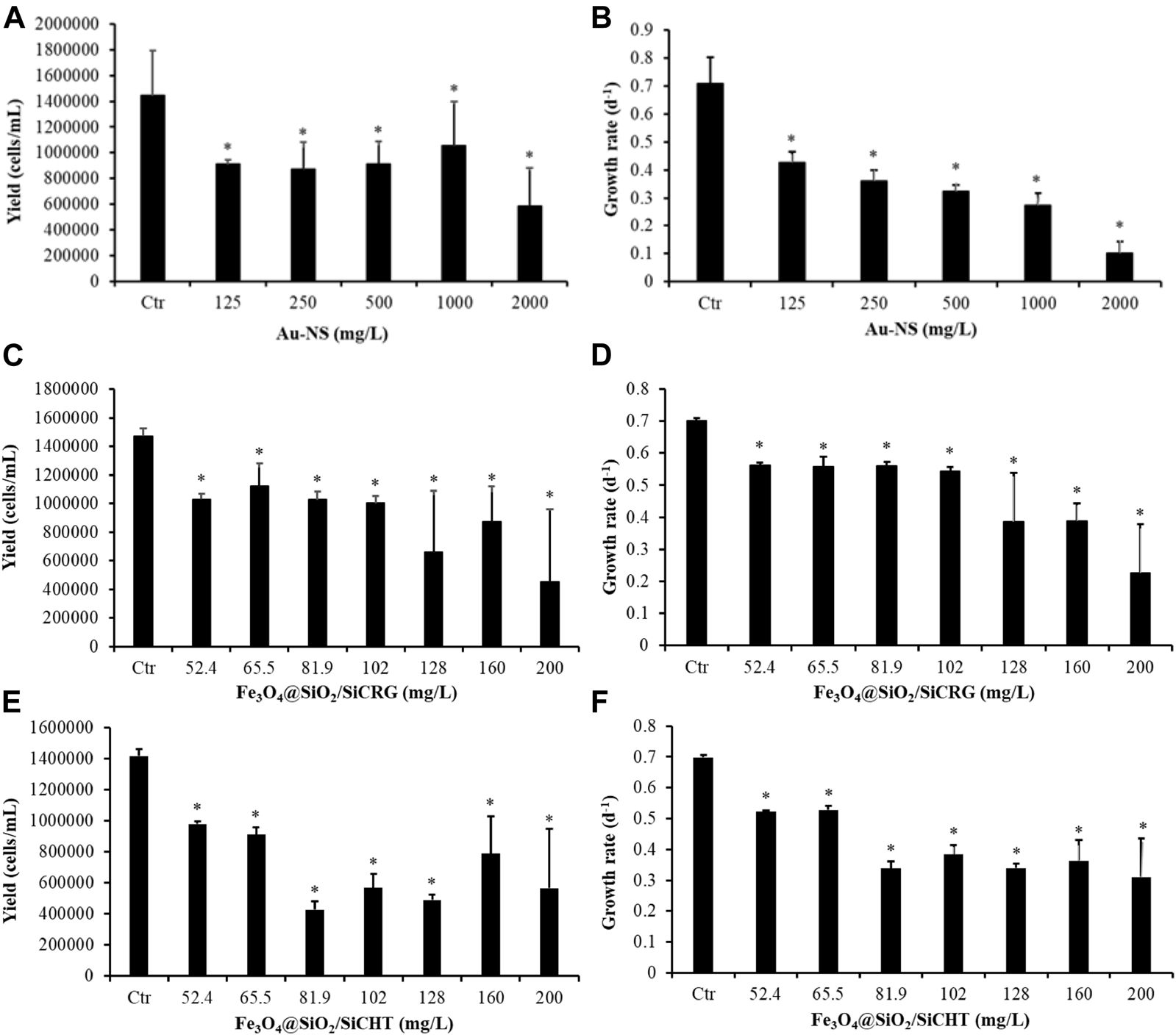 Average yield and growth rate of Raphidocelis subcapitata after being exposed, for 72 h, to several concentrations of gold nano-speres ((A) and (B) Au-NS) and of Fe3O4 nanoparticles coated with κ-carrageenan hybrid siliceous shells ((C) and (D) Fe3O4@SiO2/SiCRG) and Fe3O4 nanoparticles coated with chitosan hybrid siliceous thin shells ((E) and (F) Fe3O4@SiO2/SiCHT). * Indicates significant differences from the respective control (p < 0.05).