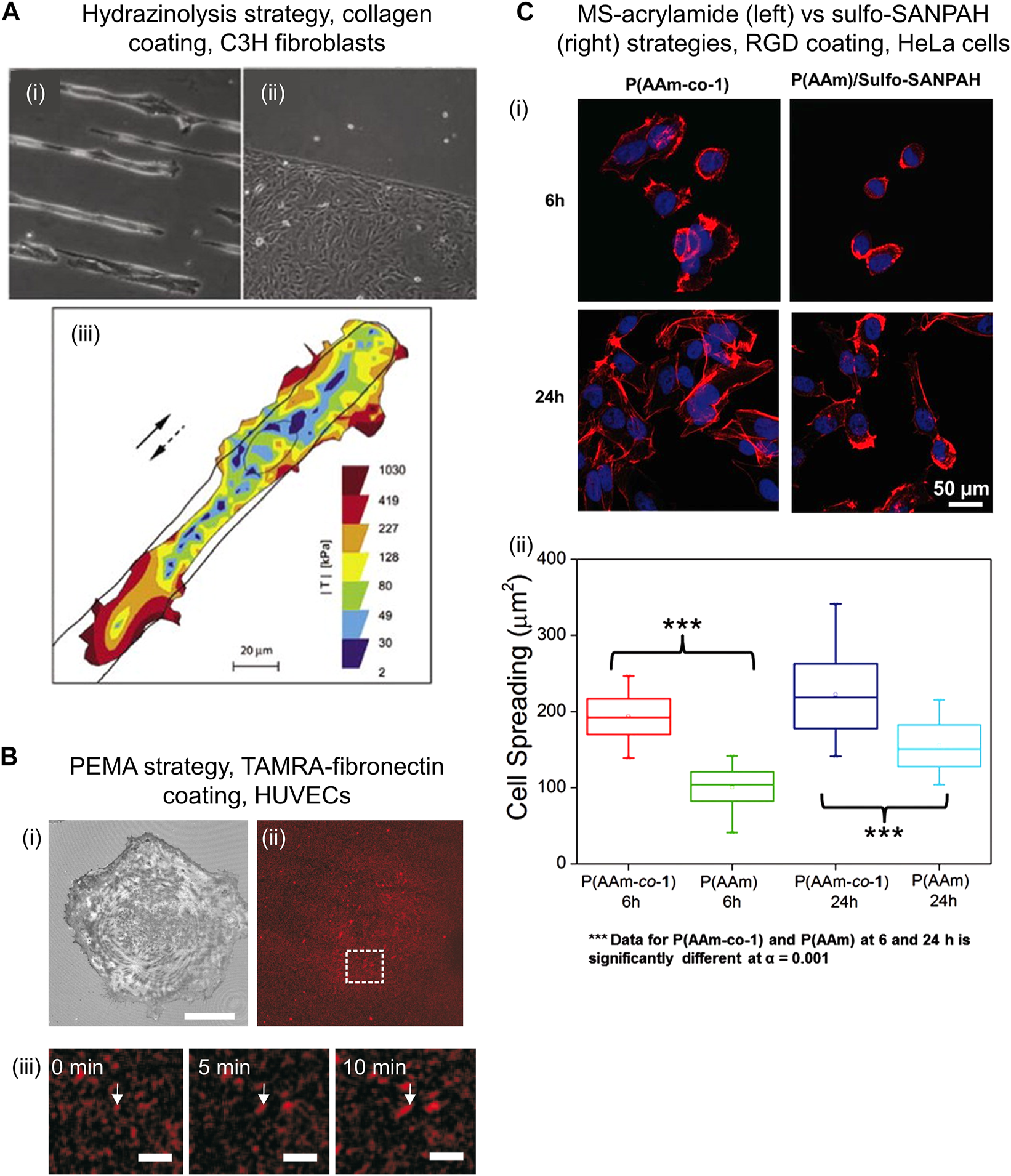Examples of cells cultured on PAM hydrogels that were biofunctionalized through diverse chemical strategies. (A) Bright field images of C3H fibroblasts on PAM gels patterned with collagen I using hydrazinolysis strategy on 15 µm stripes (i) and bottom half part of the image (ii). Cells kept viable after 3 days of seeding. Traction map of C3H fibroblast while moving along a 25 µm wide stripe of collagen I (full and dashed arrows indicate original and reversed direction, respectively) (iii). Reproduced with permission from Ref. (Damljanovic et al., 2005). Copyright 2005 Future Science Ltd. (B) Reflection interference contrast microscopy image showing adhered HUVECs after 30 min seeding (i) on PAM gels functionalized with TAMRA-fibronectin (ii) via PEMA strategy. (Pompe et al., 2011) Scale bar: 30 μm. In situ analysis of fibronectin fibrillogenesis shows growing fibronectin fibers over time, indicated by white arrows (iii). Scale bar: 5 μm. Reprinted from Ref. (Pompe et al., 2011). Copyright 2011, with permission from Elsevier Ltd. (C) Confocal fluorescence images showing Hela cells after seeding for 6 and 24 h on PAM gels functionalized with RGD peptide via MS-acrylamide (left panel) vs. sulfo-SANPAH (right panel) strategies (i). Cell spreading area on PAM-MS gels was significantly larger than on sulfo-SANPAH gels, demonstrating effective and chemo-specific ligand immobilization (ii). Reproduced with permission from Ref. (Farrukh et al., 2016). Copyright 2016 John Wiley and Sons, Inc.