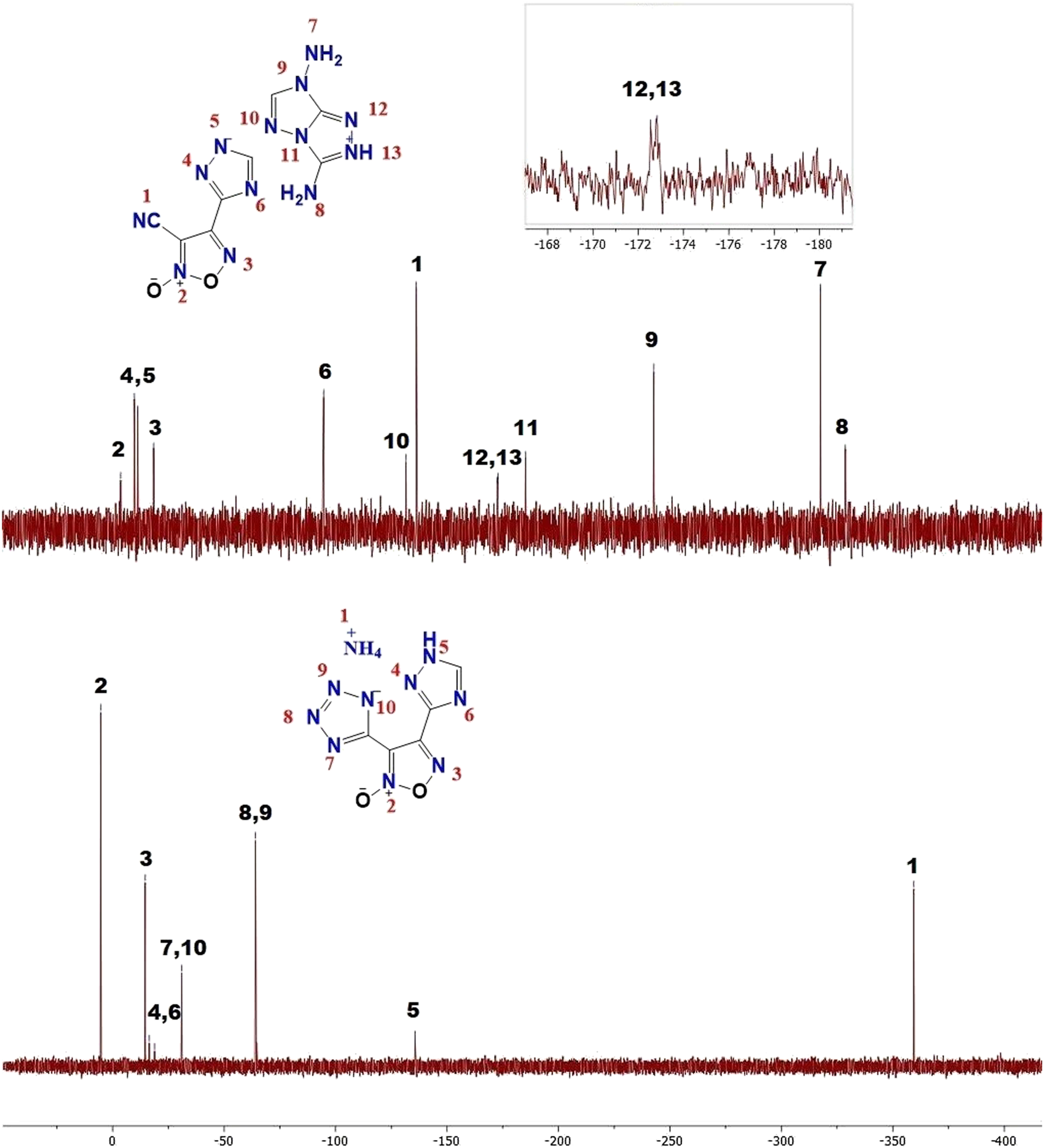 Synthesis of ammonium 5-(2-oxido-4-(1H-1,2,4-triazol-3-yl)-1,2,5-oxadiazol-3-yl)tetrazol-1-ide 6: TMSN3 (2.5 mmol, 0.33 ml) and NH4F (1 mmol, 0.037 g) were added to a magnetically stirred mixture of cyanofuroxan 3a (1 mmol) in MeCN (5 ml). The reaction mixture was stirred at 35°C for 10 h until full consumption of substrate 3a (TLC monitoring). Then, the precipitate formed was filtered off, washed with CH3CN (5 ml) and dried in a vacuum desiccator over P2O5. Yield 0.20 g (84%); beige solid; 1H NMR (300 MHz, DMSO-d6): δ = 8.65 (s, 5H); 13C{1H} NMR (75.5 MHz, DMSO-d6): δ = 150.4, 149.8, 147.7, 147.4, 110.4; 14N NMR (21.7 MHz, DMSO-d6): δ = −358.8 (s, NH4); 15N NMR (60.8 MHz, DMSO-d6): δ = 12.3, −8.0, −9.9, −12.3, −24.7, −58.3, −130.9, −358.1; IR (KBr): 3,342, 3,120, 2,989, 1,598, 1,523, 1,448, 1,416, 1,270, 1,220, 1,145, 1,076, 976, 969, 893, 835 cm−1; elemental analysis calcd (%) for C5H6N10O2 (238.17): C 25.22, H 2.54, N 58.81; found: C 25.03, H 2.68, N 58.49; IS: 12 J, FS: >360 N.