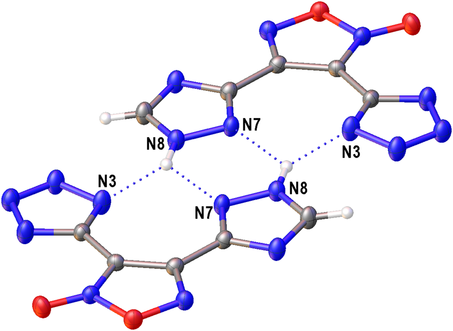 The colorless single crystals of 6 were grown from DMF. At 100 K crystals of 6 (C5H6N10O2) are triclinic, space group P-1: a = 4.8372(2), b = 9.6045(4), c = 10.1054(4) Å, α = 94.895(3), β = 92.103(2), γ = 98.814(2), V = 461.66(3) Å3, Z = 2, dcalc = 1.714 g cm−3, F(000) = 244. Intensities of 4,822 reflections were measured with a Bruker APEX II CCD diffractometer [λ(MoKα) = 0.71073 Å, ω-scans, 2θ < 58°] and 2,198 independent reflections [Rint = 0.0336] were used in further refinement. The structure was solved by direct method and refined by the full-matrix least-squares technique against F2 in the isotropic-anisotropic approximation. The hydrogen atoms were found in difference Fourier synthesis and refined in the isotropic approximation. For 6, the refinement converged to wR2 = 0.1207, GOOF = 0.992 and R1 = 0.0429 for 1,602 independent reflections with I > 2σ(I). All calculations were performed using SHELXL-2014/6 (Sheldrick, 2015). CCDC 2193015 contains the supplementary crystallographic data for 6·H2O. These data can be obtained free of charge via http://www.ccdc.cam.ac.uk/conts/retrieving.html (or from the CCDC, 12 Union Road, Cambridge, CB21EZ, UK; or deposit@ccdc.cam.ac.uk).