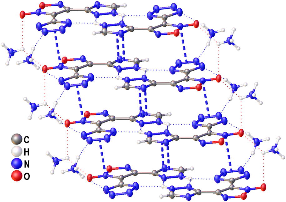 The structure of compound 6 was further confirmed by X-ray diffraction study (Figure 3). In crystal, the anionic moiety is nearly planar: the C1C2C4N7 and C2C1C3N3 torsion angles are 1.95° and 6.36°, respectively, while the mean deviation from plane composed by non-hydrogen atoms is only 0.0436 Å. The main packing motif for 6 is the aggregation of anions into centrosymmetric dimers (Figure 4) by means of two bifurcate H-bonds between the N8(H) groups of triazolyl cycle and the N3 and N7 nitrogen atoms of tetrazole and triazolyl, respectively (N8…N3 and N8…N7 distances are 2.811 and 2.923 Å, correspondingly). The further binding of these dimers is determined by the ammonia cations (Supplementary Figure S1) which form 1) one weak bifurcate NH…O H-bond with exocyclic furoxan oxygen atoms (N…O 3.018 and 3.051 Å), 2) two moderate NH…N hydrogen bonds with the tetrazole fragments (N…N 2.876, 2.954 Å, ∠(NHN) 160.6–161.2°) and 3) one moderate NH…N H-bond with the triazole ring (N…N 2.936 Å, ∠(NHN) 167.2°). The two former types of H-bonds aggregate the nearly planar dianionic dimers into infinite columns which are additionally stabilized by furoxan…tetrazole and triazole…triazole stacking interactions (the interplane distance is 3.140 Å, Figure 5). Despite the whole crystal packing pattern resembles the layer-like supramolecular aggregation, the mentioned columns are shifted against each other due to the mentioned NH…N H-bonds between the cation and triazole ring (Figure 6).