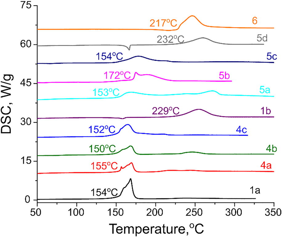 Physicochemical and sensitivity properties as well as detonation performance of all synthesized compounds were evaluated and the results are summarized in Table 1. As for thermal stability, most of the investigated salts have acceptable thermal decomposition onsets in the range of 150–172 оС. The exceptions are neutral compound 1b and two ammonium salts 5d and 6, which all have thermal stability in conventional linear heating DSC tests above 200°C (Figure 7).