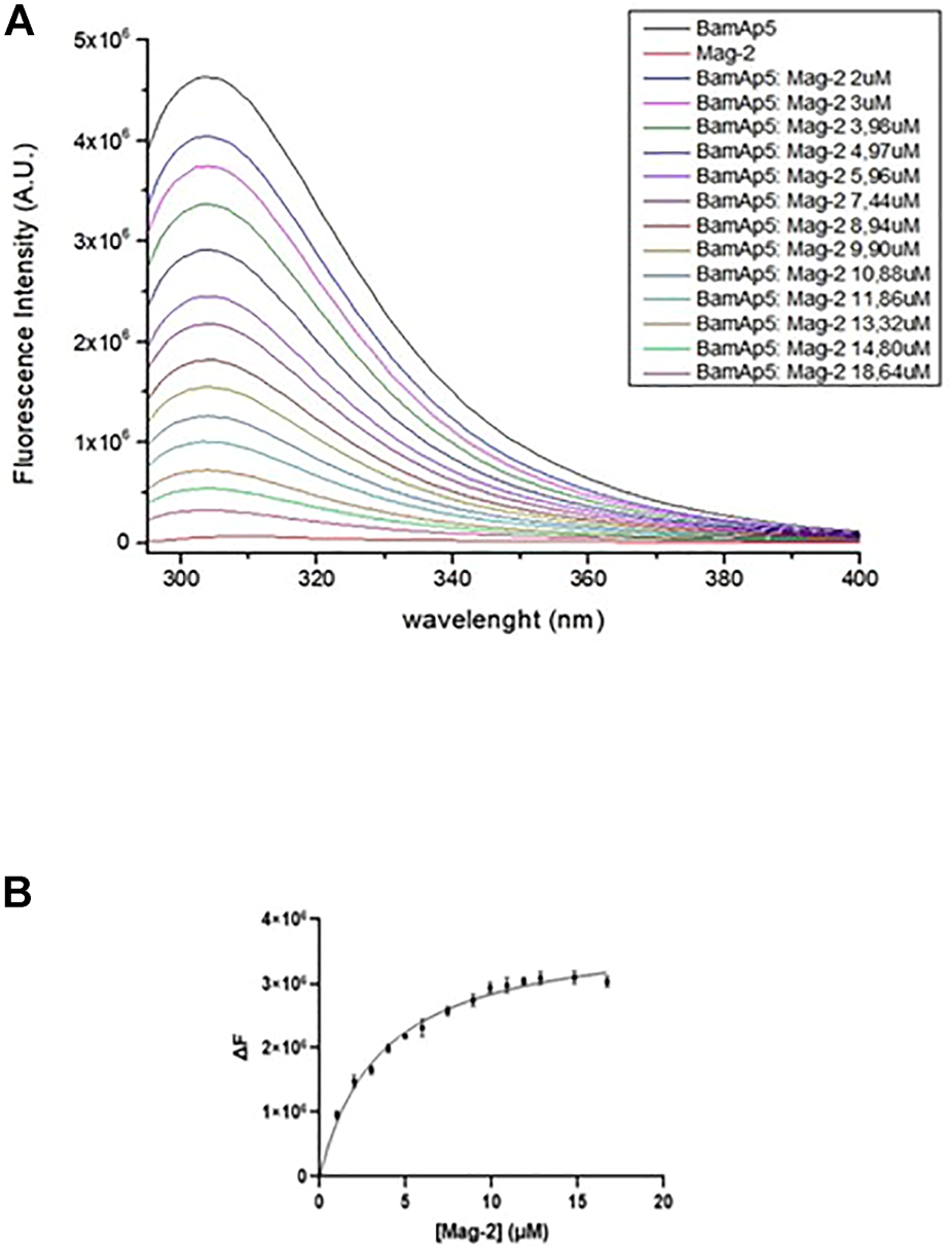 (A) Intrinsic fluorescence spectra (λexc = 280 nm) of 3.7 × 10−6 M BamAp5 by adding different concentration of Mag-2 every 5 min at 20°C. (B) Binding of Mag-2 to BamAp5 as determined by fluorescence experiments.