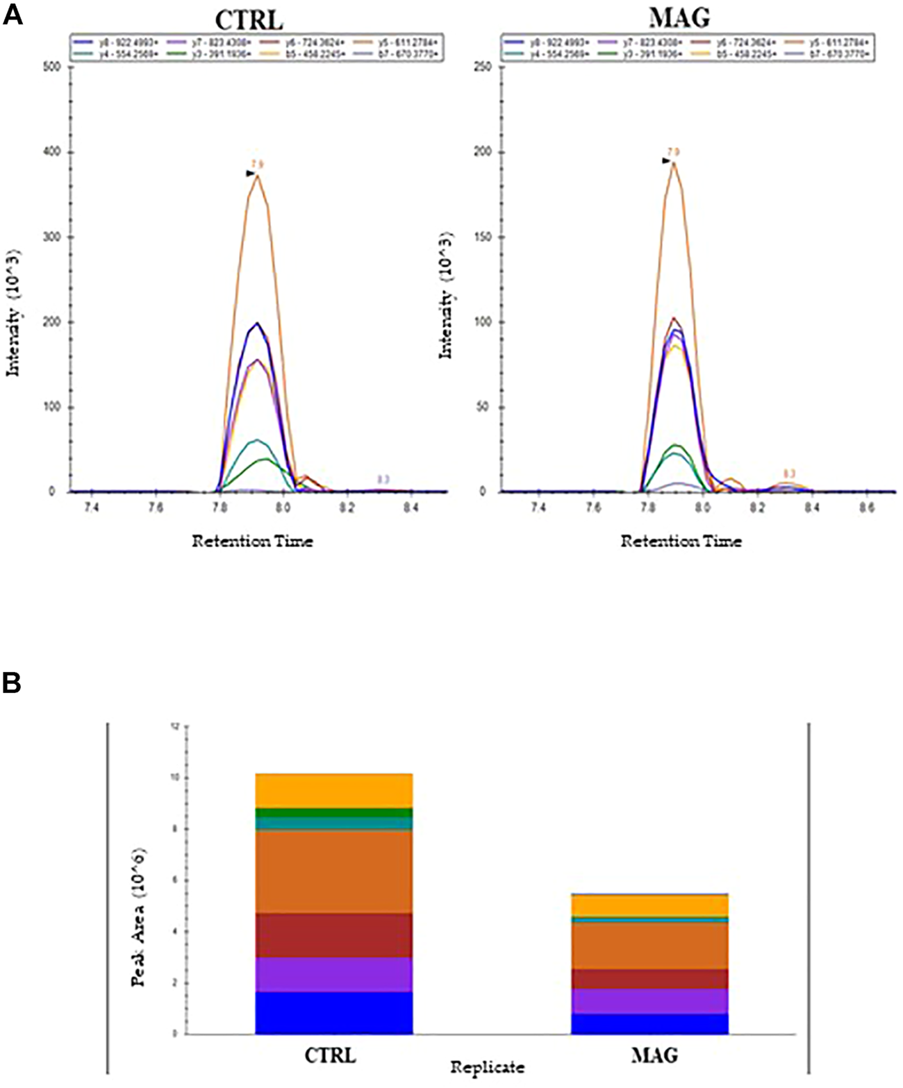 Table 1 summarizes the amino acid sequence for the selected peptides, the m/z of precursor ion and product ions and the corresponding Collision energy (CE) values to set up the MRM-MS method.