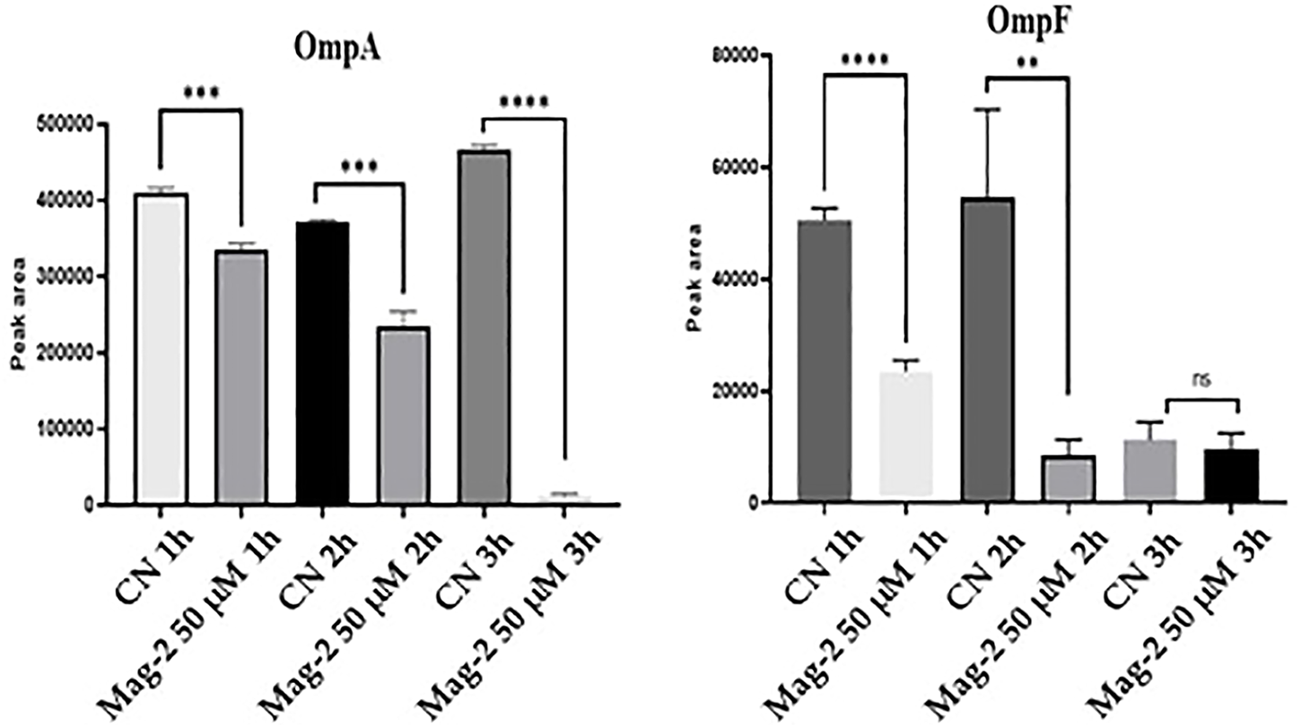 The identification of peptides performed by full scan LC-MS/MS analysis was useful to select the best peptides of OmpA and OmpF to be monitored by LC-MS/MS in Multiple Reaction Monitoring (MRM) ion mode.
