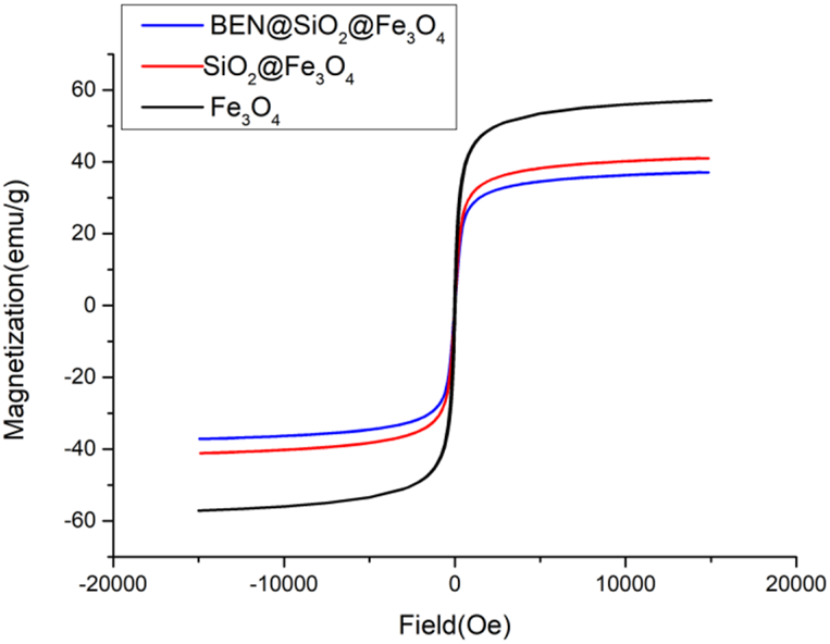 Magnetization loops for BEN@MS@Fe3O4, SiO2@Fe3O4, and Fe3O4.
