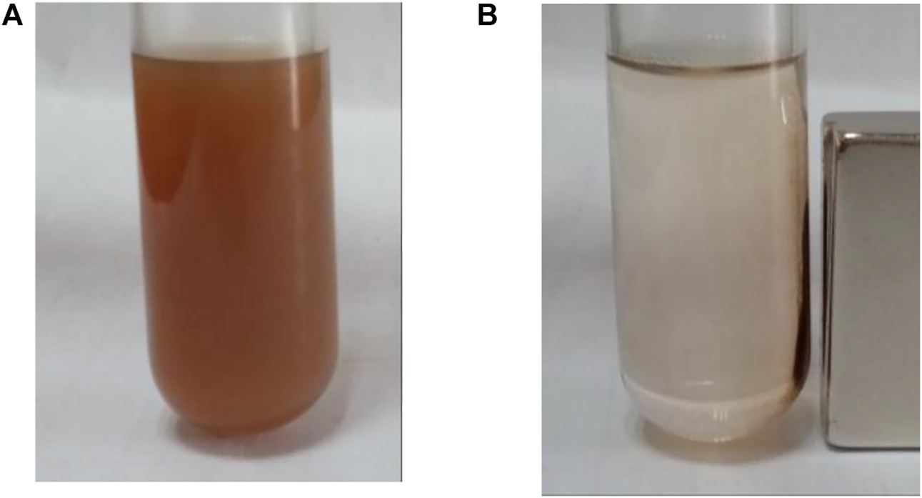 BEN@MS@Fe3O4 in ethanol solution (A) without magnetic field, and (B) with the presence of a magnet.
