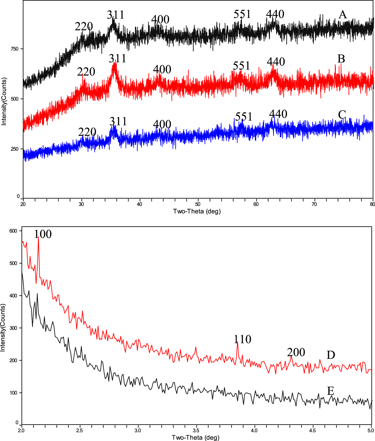 WAXRD results of (A) BEN@MS@Fe3O4, (B) MS@Fe3O4, (C) Fe3O4 particles and SAXRD results of (D) MS@Fe3O4, (E) BEN@MS@Fe3O4.