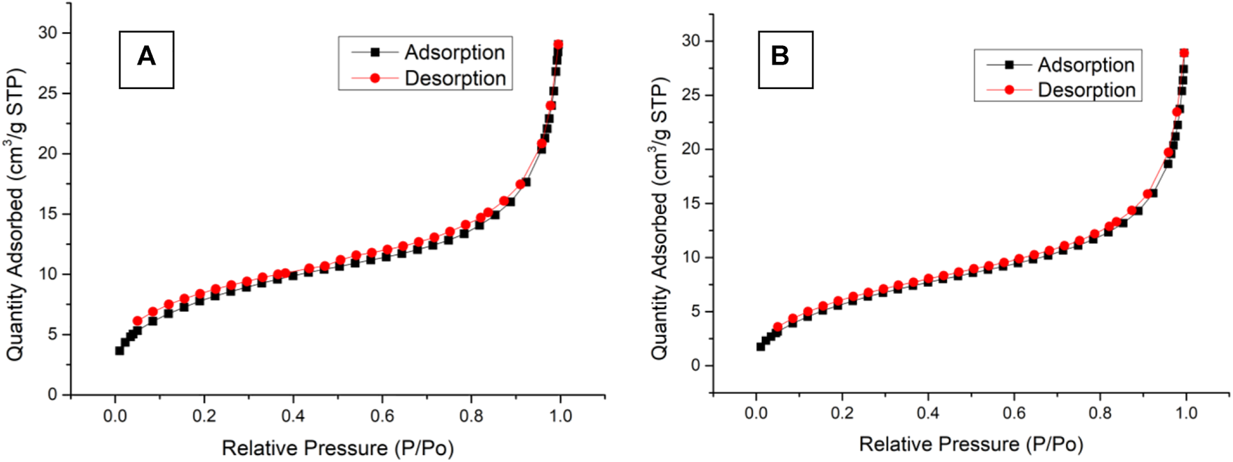 Nitrogen adsorption/desorption isotherms of (A) MS@Fe3O4 and (B) BEN@MS@Fe3O4.