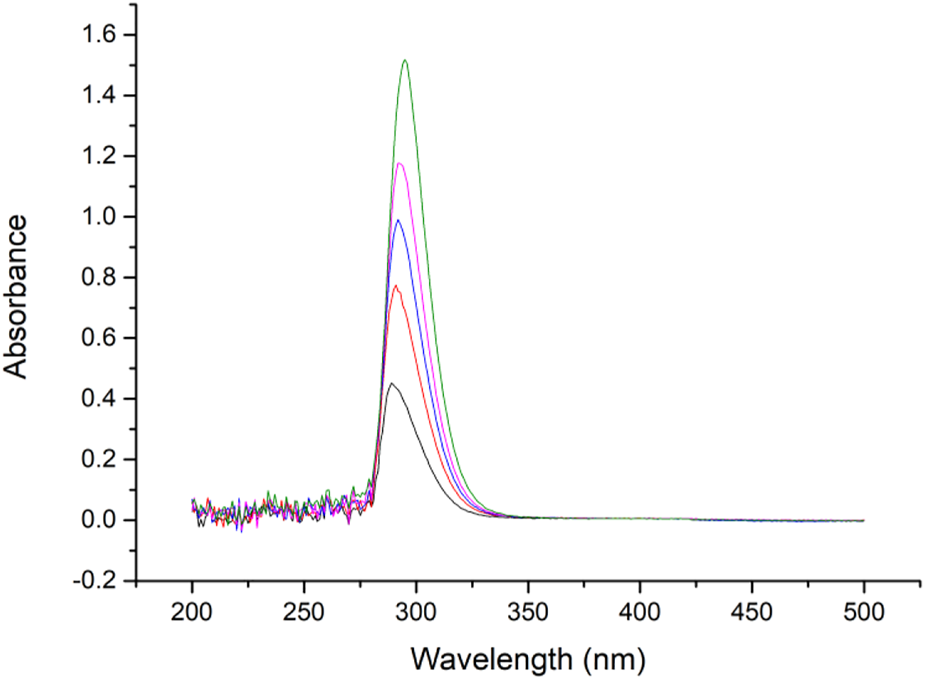 Benzophenone hydrazine connected to the MCM-41 was used for gating molecules, and can swing its C=N bond under certain irritations. Previous papers indicate that C=N bonding has a peak absorbance at approximately 300 nm (Thurston et al., 2004; Romero et al., 2015), and therefore the absorbance curve was tested. It can be seen in Figure 8 that the benzophenone hydrazine has a maximum peak at about 297 nm, hence in our research 310 nm LED was selected as an irritation source.