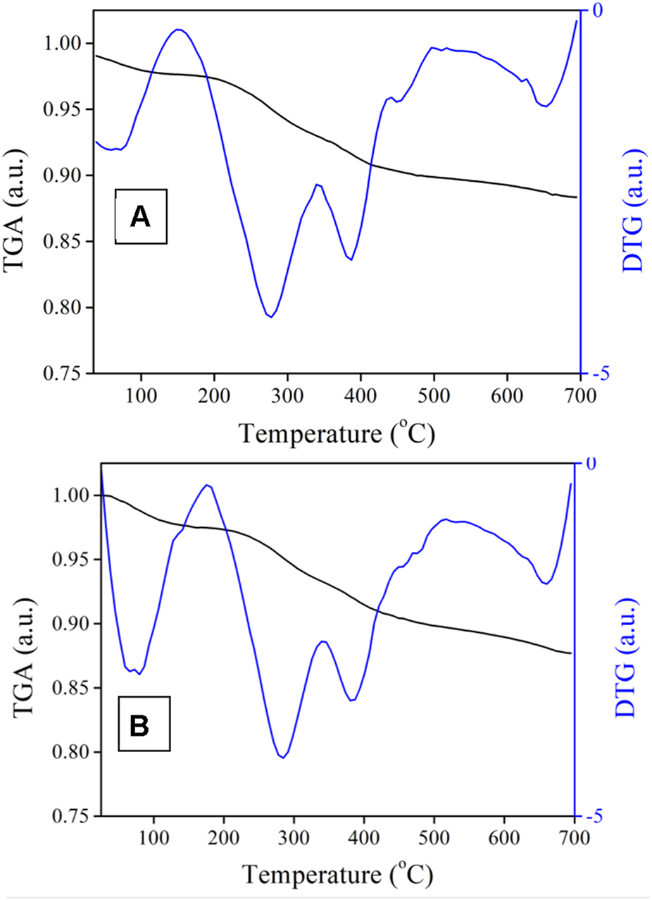 TGA of (A) BEN@MS@Fe3O4 and (B) DNR@MS@Fe3O4.