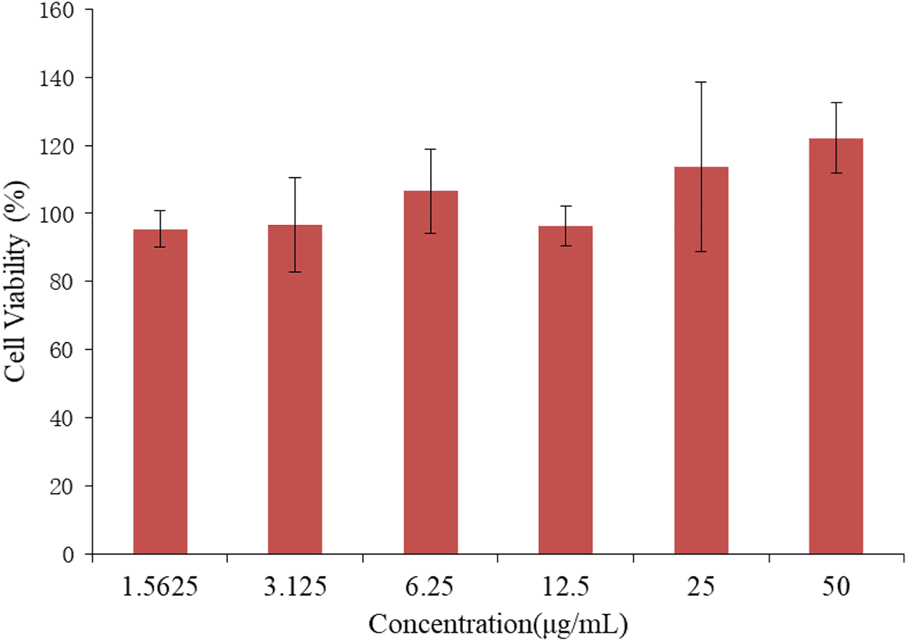 As a carrier of drug molecules, the nanocomposite prepared in research must satisfy a fundamental property, that is, the carrier must be nontoxic and bio-safe. In this regard, BEN@MS@Fe3O4 was firstly checked for biocompatibility using the MTT method. The SMMC-7721 cell line was used to perform the testing. As is shown in Figure 10, the SMMC-7721 cell line that was exposed to the nanocomposite with a concentration of up to 50 μg/ml did not show obvious growth inhibition in this experiment. This indicates that our carrier has no cytotoxicity for the morbid tissues. We prudently believe that our drug carrier could be used as a candidate for a drug delivery system.