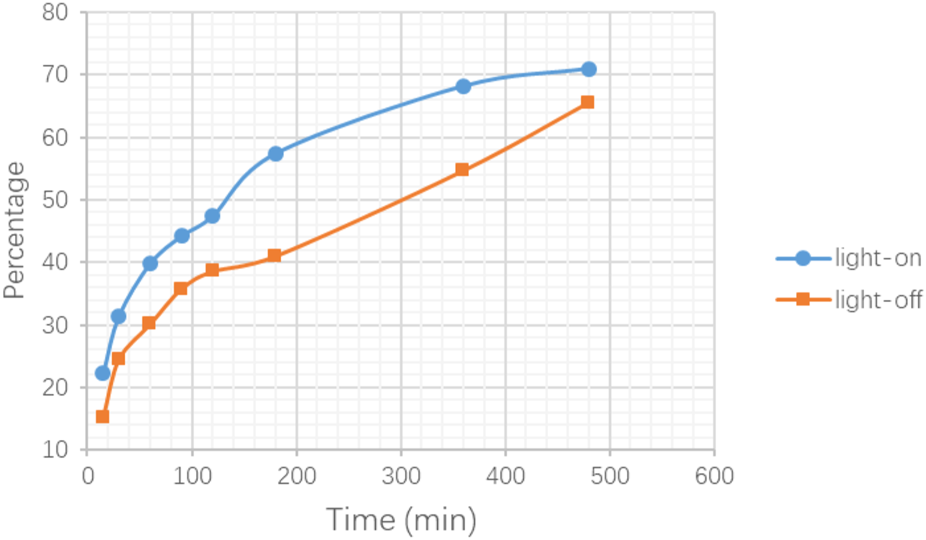 Release testing in PBS for DNR@MS@Fe3O4 with light-on and light-off.