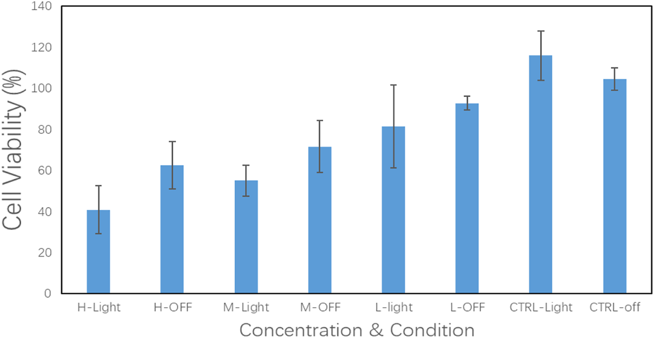 In order to provide a reference for subsequent cell experiments, a preliminary exploration was made of the release performance upon the carrier with different conditions and different times. The result shown in Figure 11 illustrates that, under light stimulation, the drug molecules loaded on the nano-carriers were released more quickly, especially at 3 h, and the concentration increased by 39% compared with the non-light counterpart. However, the difference in drug concentration between the two experimental conditions gradually narrowed over time. On the one hand, when the drug molecules in the light-on group were rapidly released into the solution, the concentration difference between the inside and outside of the molecular sieve pores became smaller, which delayed the further release of the drug molecules. On the other hand, in the light-off counterpart, the drug molecules could also be slowly released from the molecular sieve pores through thermal motion and diffusion. Therefore, for the in vitro experiments, the administration time using the nano-carrier should be the time needed to reach the maximum release concentration difference between light on/off.