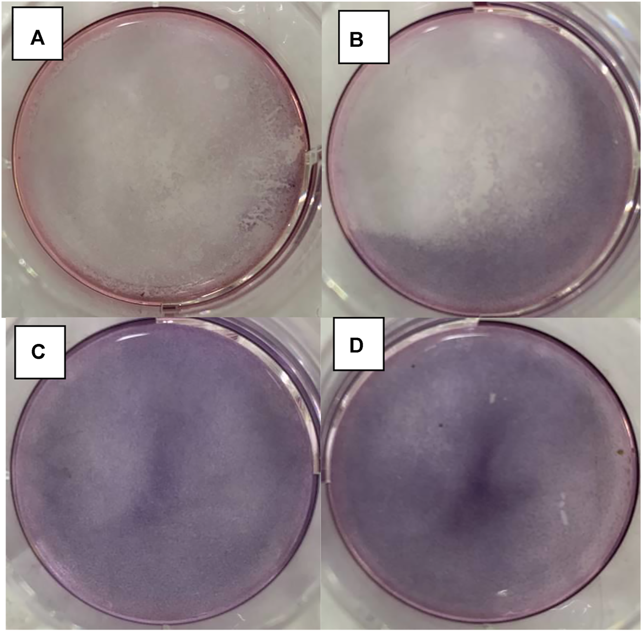 DNR@MS@Fe3O4in vitro release testing upon 6-well plate method. (A) Light and magnetic, (B) magnetic only, (C) without light or magnetic, and (D) control group.