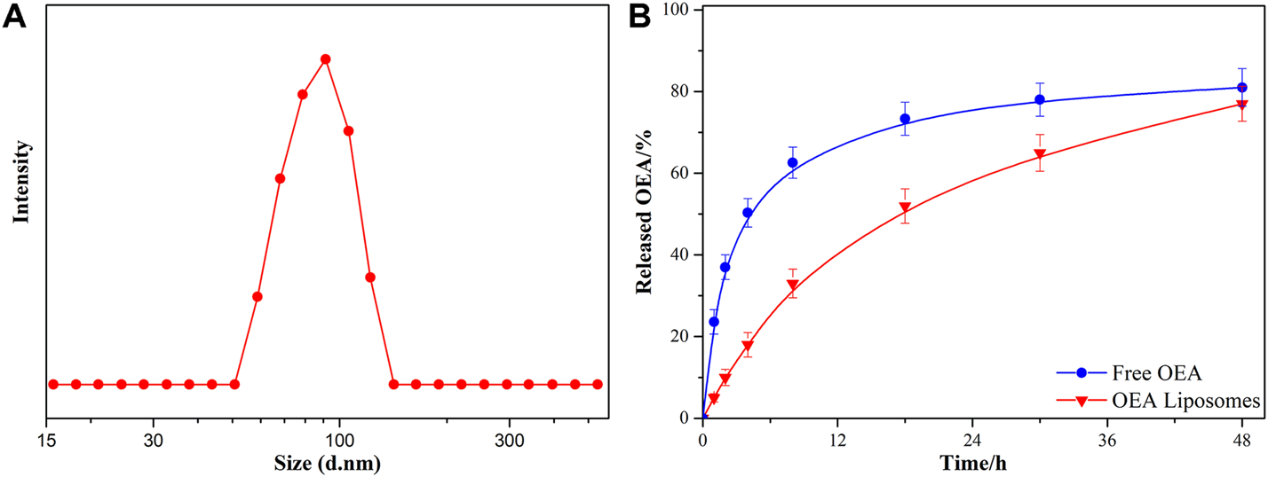 The size (A) and in vitro drug release profiles (B) of OEA Liposomes.