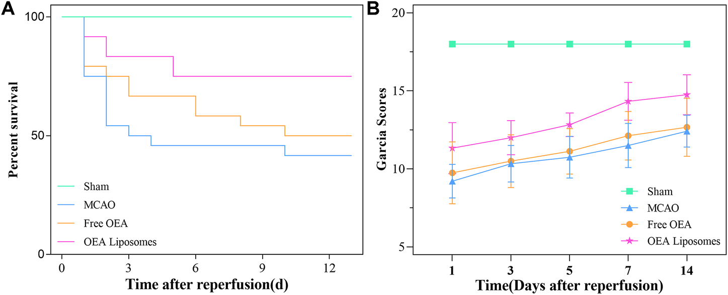 As an acute central nervous system disease, ischemic stroke possessed high mortality. Hence, reducing death rates must be the primary task to a formulation for stroke. So the survival rate of the MCAO rats injected with the indicated formulations {0.9% NaCl [MCAO], free OEA, and OEA Liposomes, [(OEA) = 1.5 mg/kg]} was recorded. As shown in Figure 3A, only 41.7% of the MCAO rats without treatment could survive for 14 days, indicating the severe damage and high mortality of MCAO. The injection of free OEA could not significantly improve this data, and there were still more than half of the MCAO rats who died within 14 days. In comparison, OEA Liposomes could obviously increase the survival rate to 75%. Only three MCAO rats injected with OEA Liposomes died from the cerebral injury. The result indicated that the administration of OEA Liposomes could build up resistance to cerebral ischemia significantly and extend the time window for beneficial reperfusion (Campbell et al., 2019).