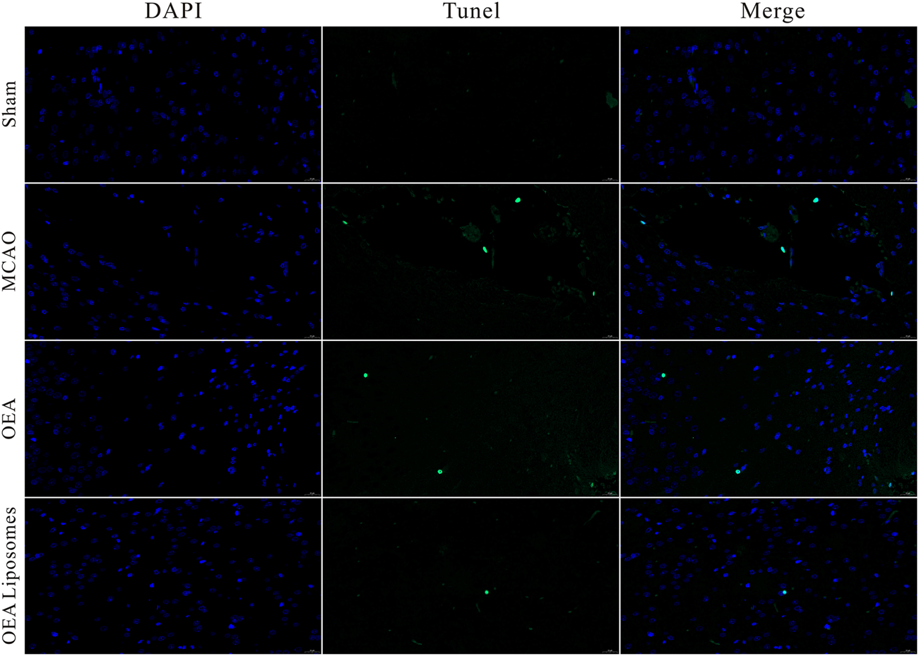 The neurological function deficit might come from the apoptosis of neurons, which were really hard to recover and would lead to intractable sequelae (Dirnagl et al., 1999; Tuo et al., 2022). Herein, TUNEL staining was employed to evaluate the ischemia reperfusion induced apoptosis in the cerebral cortex. As shown in Figures 4, 5, there was no apoptotic cell in the cerebral cortex of the sham-operated rats, suggesting their good brain condition. And significantly increased apoptotic cells were observed in the rats’ brains of the MCAO group and OEA group. The result indicated that the ischemia reperfusion indeed induced the apoptosis of the neurons, and this could not be improved by the injection of free OEA. On the contrary, the administration of OEA Liposomes could obviously protect the neurons from apoptosis, and only one apoptotic cell was observed in the field. The result indicated the excellent neuroprotective effect of OEA Liposomes.
