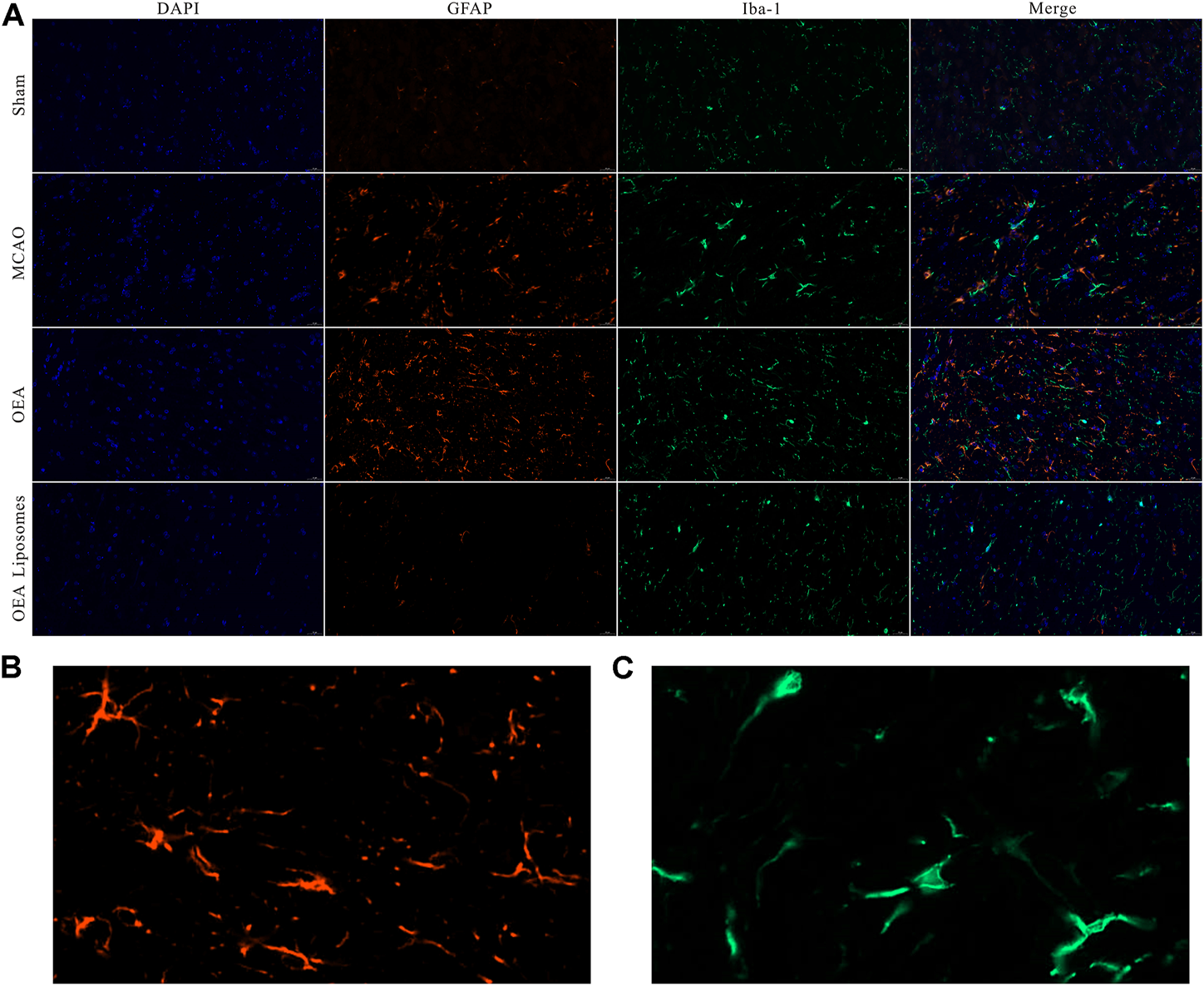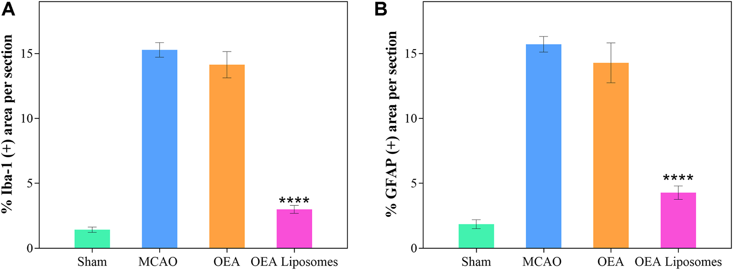 According to our previous study, the OEA works as a neuroprotective candidate by inhibiting the inflammation, which is one of the primary causes of severe brain damage. The inflammation in the brain was mainly mediated by microglia and astrocyte, which would be specifically marked by Iba-1 and GFAP, respectively. Here, the Iba-1 and GFAP in the cortex were marked to access the inflammation after reperfusion. As depicted in Figures 6, 7, both markers indicated that the brain from the rats of the MCAO group or the OEA group possessed a largely increased inflammation compared with the Sham group. However, the administration of OEA Liposomes could significantly inhibit the inflammation caused by ischemia reperfusion, which was almost as slight as that of the Sham group. The result suggested that the OEA Liposomes could inhibit the inflammation of ischemia reperfusion to a very slight level, and therefore, provide significant neuroprotective effects.