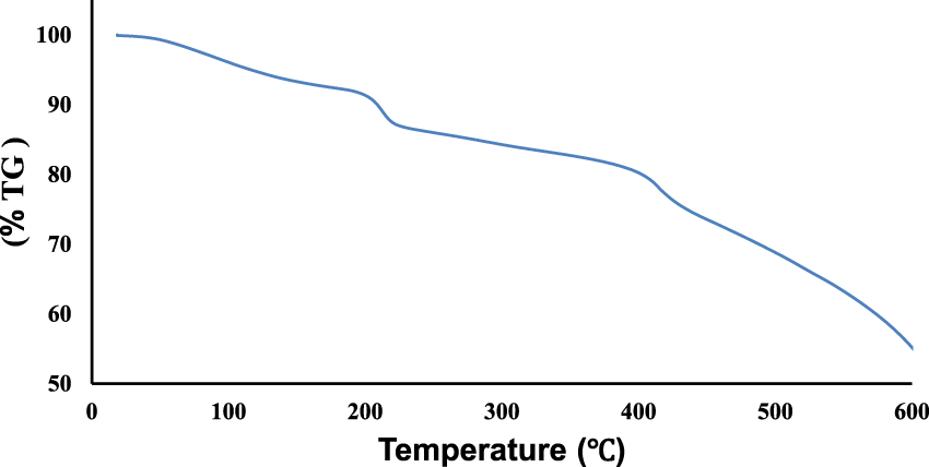 The results obtained from the thermal stability curve of Fe3O4/Zn-metal organic framework magnetic nanostructures show that in the temperature range of 90–100 °C, the partial weight decreases due to the evaporation of the solvent on the surface of the sample (Figure 3). The partial weight loss in the second stage in the temperature range of about 190 C is related to the evaporation of the solvent trapped in the nanoparticle structure. In the third stage, a noticeable weight loss in the sample was observed first in the range of 392 C of the pure Fe3O4/Zn-metal organic framework magnetic nanostructures. Then, at near 600 C, we see the beginning of the degradation and collapse of the final Fe3O4/Zn-metal organic framework magnetic nanostructures. From the observations, it can be concluded that Fe3O4/Zn-metal organic framework magnetic nanostructures had high thermal stability. The high thermal stability can be provided the advantages and potential applications of these synthesized compounds in the optimal microwave method.