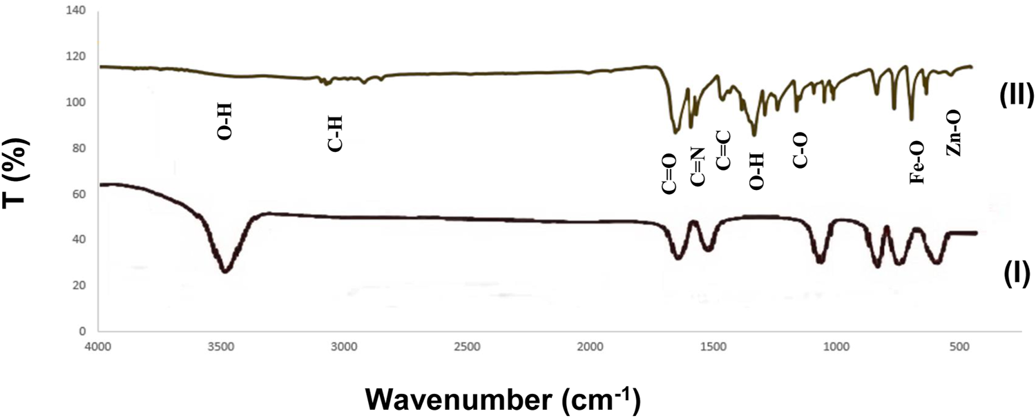 FTIR spectrum of Fe3O4 (I) and Fe3O4/Zn-metal organic framework magnetic nanostructures (II).