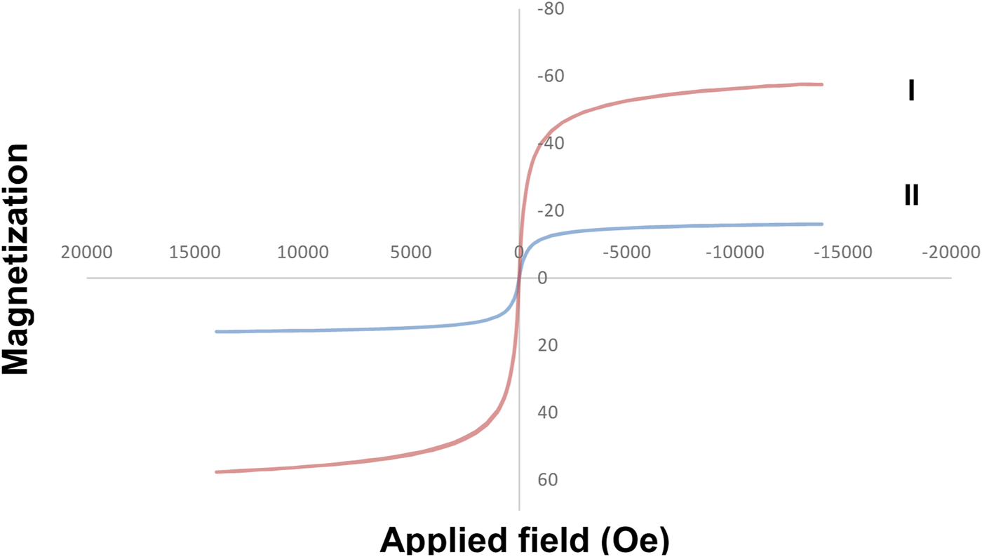 Magnetic property curve of Fe3O4 (I) and Fe3O4/Zn-metal organic framework magnetic nanostructures (II).