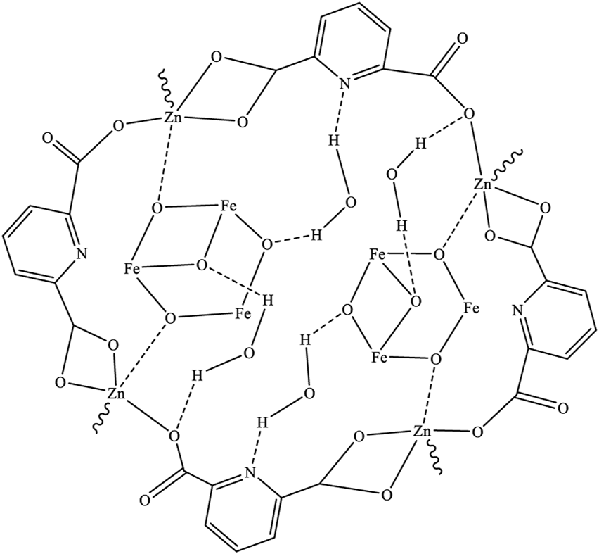 Based on the obtained spectral data, the structure of Figure 8 was proposed for Fe3O4/Zn-metal organic framework magnetic nanostructures.