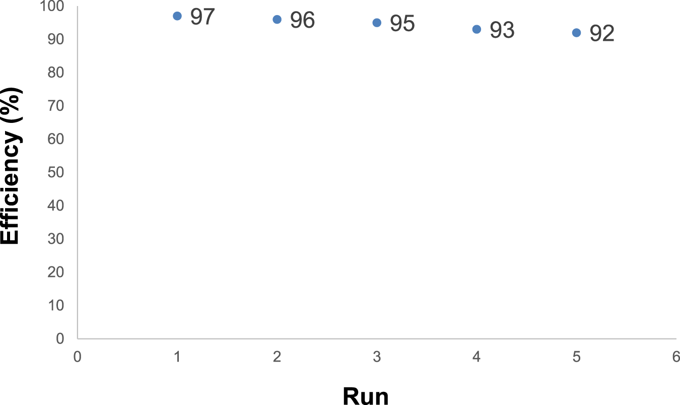 The results of ICP showed that 0.03 g of Fe3O4/Zn-metal organic framework magnetic nanostructures contain ×3.4710–3 g of zinc or 5.3 × 10–5 mol or Zn, therefore in optimal conditions, TON and TOF were obtained, 18×105 and 180,000 min−1, respectively.