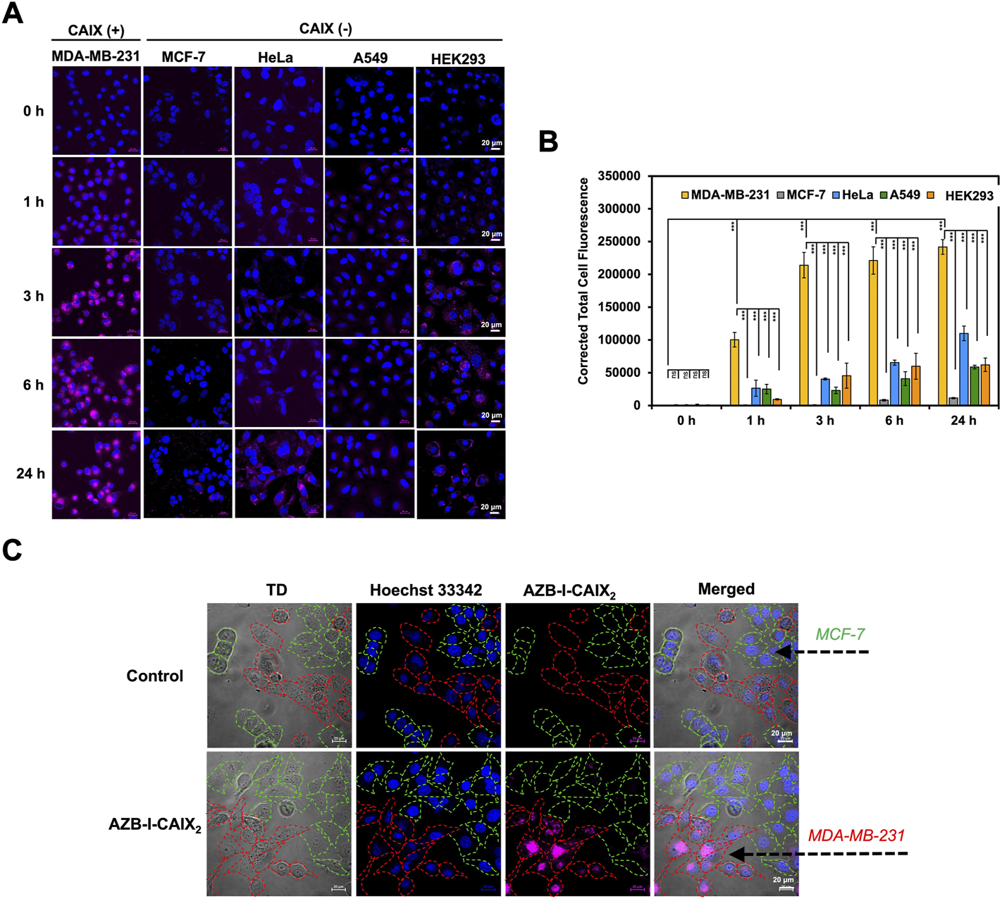 Selective CAIX-dependent uptake of AZB-I-CAIX2 on various cells. (A) Time-dependent cell internalization of AZB-I-CAIX2 tested on CAIX+ (MDA-MB-231) and CAIX- (MCF-7, HeLa, A549, HEK293) cells. (B) Corrected Total Cell Fluorescence (CTCF) of signals from experiment (A) (C) Confocal images of AZB-I-CAIX2 internalized CAIX+ (MDA-MB-231) and CAIX- (MCF-7) in the co-culture system. Statistical analysis: One-way ANOVA followed by Tukey’s analysis was used for comparison between multiple groups using GraphPad Prism9 software. p values of less than 0.05 (95% confidence interval) are considered significant (ns p < 0.12, * p < 0.033, ** p < 0.002, *** p < 0.001). Scale bar = 20 μm.