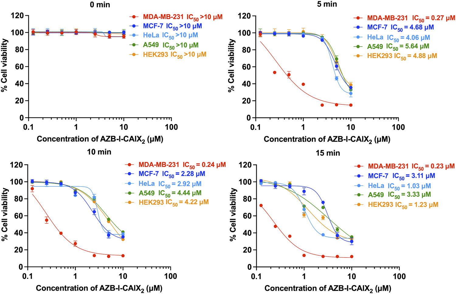 Half maximal inhibitory concentration (IC50) curves of AZB-I-CAIX2 tested on CAIX+ (MDA-MB-231) and CAIX- (MCF-7, HeLa, A549, HEK293) cells under various light exposure times (0 min, 5 min, 10 min, 15 min). The cells were incubated with various concentrations of AZB-I-CAIX2 (0–10 μM) for 6 h and irradiated with a lamp (660 nm, power density of 8.7 mW cm−2). IC50 was evaluated using GraphPad Prism9 software.
