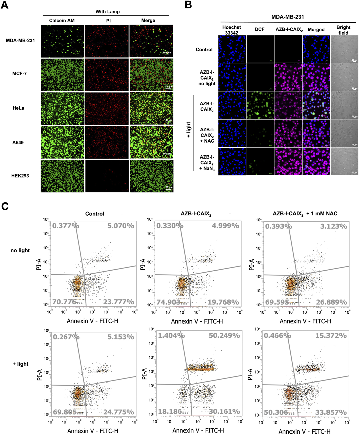Approximately 1 × 106 cells/well of MDA-MB-231 were seeded on a 6-well plate for 24 h. After that, the cells were treated with 0.5 μM of AZB-I-CAIX2 and 1 mM of ROS scavenger reagent (N-acetyl-L-cysteine (NAC, TCI) for 6 h. The cells were then washed with 0.01 M PBS buffer (pH 7.4) twice before irradiation with a red LED lamp (660 nm, power density of 8.7 mW cm−2) for 5 min. Then, the cells were trypsinized and washed three times with ice-cold PBS buffer (0.01 M, pH 7.4) by centrifugation at 4,000 rpm at 4°C for 3 min and resuspend in 1X Annexin binding buffer (Thermo Fisher Scientific). The cells were incubated on ice with Annexin V fluorescein conjugate (FITC annexin V, Thermo Fisher Scientific) at room temperature for 15 min before adding propidium iodide (PI, Thermo Fisher Scientific). Then, 1 × 104 events were analysed by flow cytometry using an Attune NxT Flow Cytometer (Thermo Fisher Scientific).