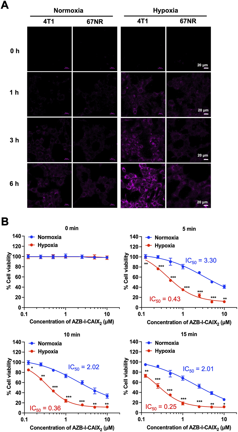 4T1 has seeded on a 96-well plate of approximately 7 × 103 cells per well and incubated in completed medium for 24 h. Thereafter, the cells were incubated under normoxic (humidified 95% air, 5% CO2 atmosphere) and hypoxic (5% pO2) conditions at 37°C for 12 h before being treated with 0, 0.125. 0.25, 0.5, 5, 10 μM of AZB-I-CAIX2 for 6 h. We induced the hypoxia condition following STEMCELL Technologies Inc. (Vancouver, BC, Canada) methods using a hypoxia incubator chamber and references’ protocol (Su et al., 2016). After incubation, the cells were washed twice with 0.01 M of PBS buffer (pH 7.4) to remove excess probes and added to the completed medium before being irradiated with a red LED lamp (660 nm, power density of 8.7 mW cm−2) for 0 min, 5 min, 10 min, and 15 min and continued culturing for 24 h in dark. Cell viability was detected by 20 μl of methylthiazolyldiphenyl-tetrazolium bromide (MTT reagent, 0.5 mg ml−1, Sigma-Aldrich) for 2.5 h incubation time. After media removal, DMSO was added to dissolve the formazan product and detected through UV-vis absorption of formazan at wavelength 560 nm (BMG Labtech/SPECTROstar Nano microplate reader). IC50 values of cell viability were evaluated by GraphPad Prism9 software. Statistical analysis: t-test followed using GraphPad Prism9 software. p values of less than 0.05 (95% confidence interval) are considered significant (ns p < 0.12, * p < 0.033, ** p < 0.002, *** p < 0.001).