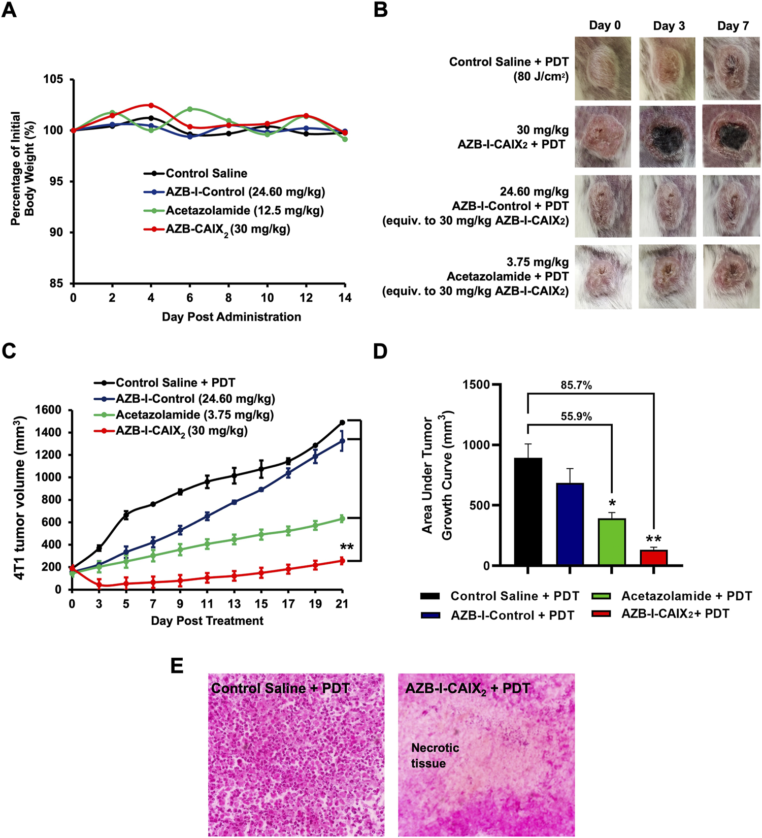 The fur of Balb/C mice was shaved and murine 4T1 breast carcinoma cell lines at a density of 5 × 105 cells/mouse were orthotopically injected into the mice’s mammary fat pads. AZB-I-CAIX2, AZB-I-Control, and acetazolamide were dissolved respectively in a cocktail of 2.5% cremophore EL and 2.5% ethanol, and further resuspended in the saline to a volume of 0.2 ml, for injection. The 4T1 breast tumor growth was observed and measured daily until the tumor size reached 150–180 mm3 (for high CAIX expression) (Rabbani et al., 2009). Once the tumor growth reached 150–180 mm3, the mice were randomly divided into groups for the experiment. The 4T1 tumor-bearing Balb/c mice were treated intravenously with saline, AZB-I-CAIX2 (30 mg/kg), AZB-I-Control (24.60 mg/kg equiv. to 30 mg/kg AZB-I-CAIX2), and acetazolamide (3.75 mg/kg equiv. to 30 mg/kg AZB-I-CAIX2). The mice were then kept in the dark for 1 h. After 1-h administration, the mice were administered with an anesthesia cocktail of 0.1 ml ketamine (90 mg/kg ketamine and 10 mg/kg xylazine) intraperitoneally. The mice were irradiated by using Lumacare LC-122A fiber-optic light delivery system at 80 J for 8 min (Fluence rate: 160 mW). The tumor size was then observed and measured every 2 days using a digital caliper. Tumor volume was calculated using the formula [(L x W2)/2], where the reading for L is the longest dimension and W is the shortest dimension.