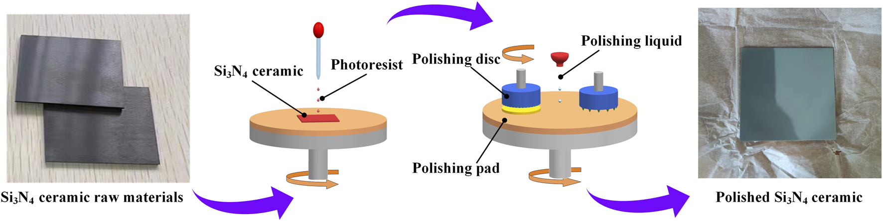 3) Patterned exposure: The Si3N4 ceramic coated with photoresist were placed upward, and the mask plate with lithography pattern placed downward into the lithography machine to ensure that the mask plate and the silicon wafer were fixed. The pattern on the mask printed by the was transferred to the Si3N4 ceramic at a ratio of 1: 1;