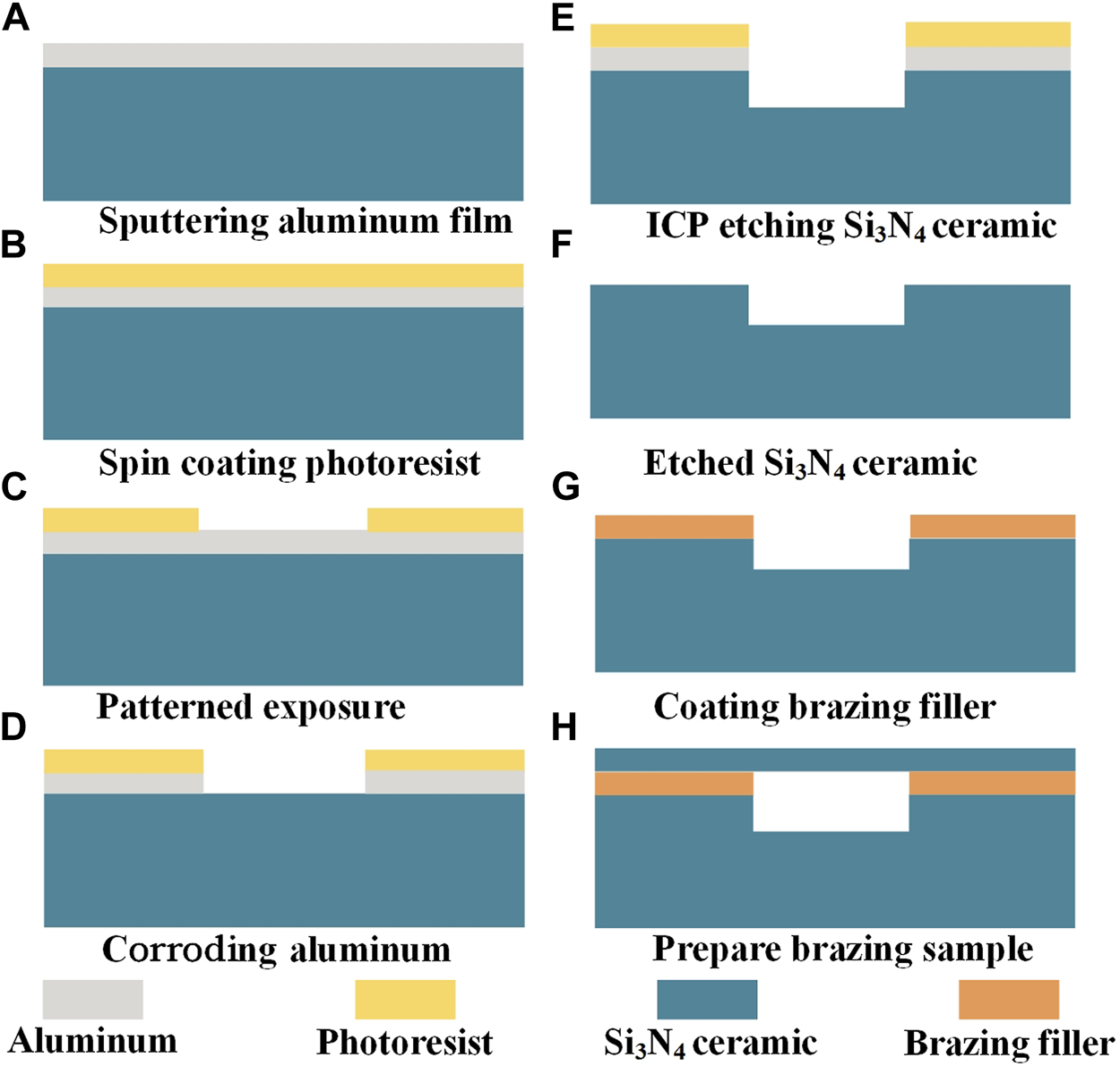 Etching process and brazing process of Si3N4 ceramic: (A) Sputtering aluminum film. (B) Spin coating photoresist. (C) Patterned exposure. (D) Corroding aluminum. (E) ICP etching Si3N4 ceramic. (F) Etched Si3N4 ceramic. (G) Coating brazing filler. (H) Prepare brazing samples.