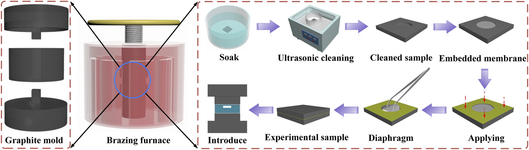 The prepared samples were then placed in a graphite mold. The mold comprises an upper indenter, a sleeve, and a lower indenter. Owing to the pressure provided by the upper indenter, ceramic tightness can be guaranteed during the brazing process. Contact with lower indenter was combined to apply pressure evenly on the sample surface. The assembled mold was then introduced into a brazing furnace for high-temperature brazing. The brazing furnace device rapidly heated the Si3N4 ceramic to be welded using electrodes, with the heating speed controlled by controlling the power of the workpiece with a pressure pump and a header displacement control system. Simultaneously the hot-pressing furnace table was provided with a column connection on the movable beam to ensure the verticality of the compression. A schematic diagram of the brazing furnace and the sample processing process is presented in the Figure 3. To avoid contaminating the cavity, during the coating process of the brazing filler, a membrane with the same size as the cavity was utilized to cover the cavity, and after the coating was completed, the membrane was gently removed with tweezer.