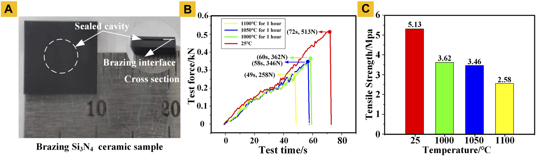 (A) Brazed Si3N4 ceramic sample (B) The curves of test time and test force after different temperature; (C) Tensile strength tests after different temperature.