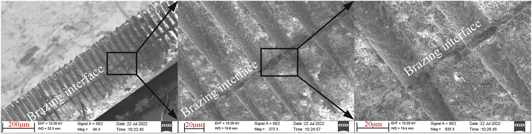 To investigate the quality of the internal connections, the samples were cut along the cross sections, which were then gold-sprayed and imaged under a scanning electron microscope (SEM). Figure 6 presents the SEM images of the brazed sample’s cross section at different magnifications. It can be observed that the brazing interface is neat, smooth and tightly connected.