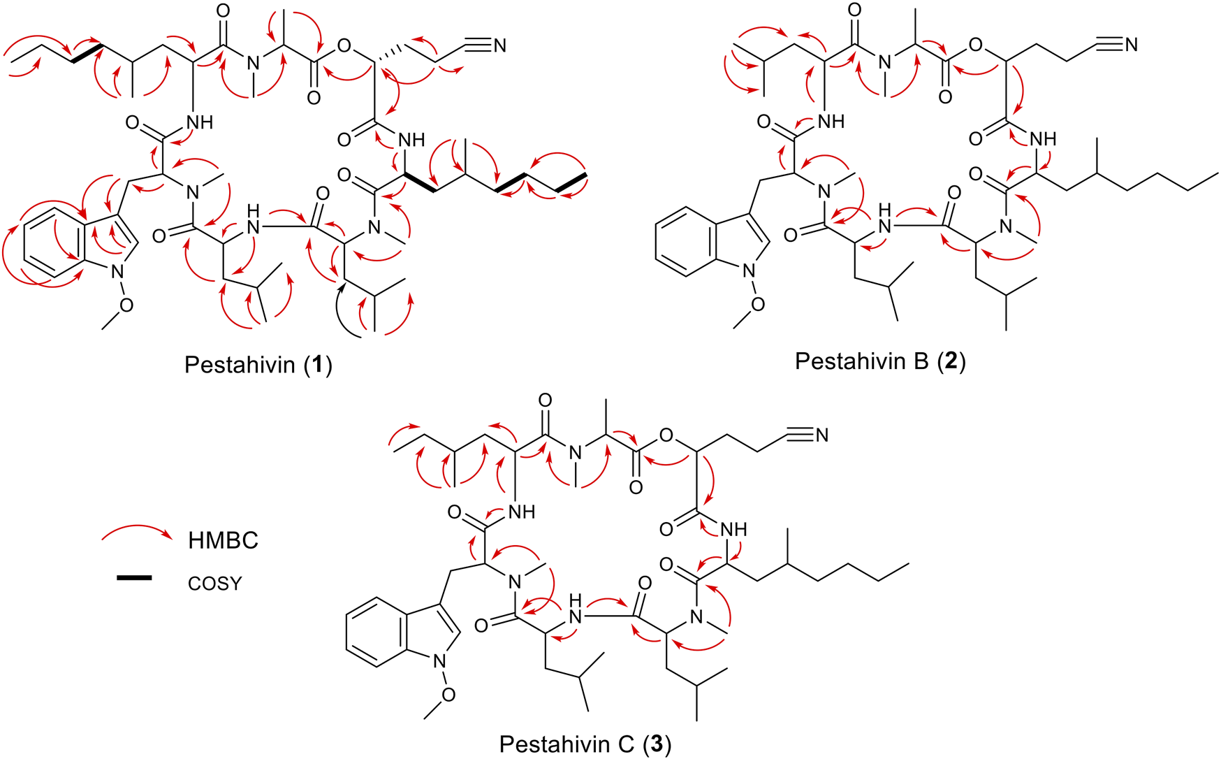 Structures of pestahivin (1), pestahivin B (2) and C (3).