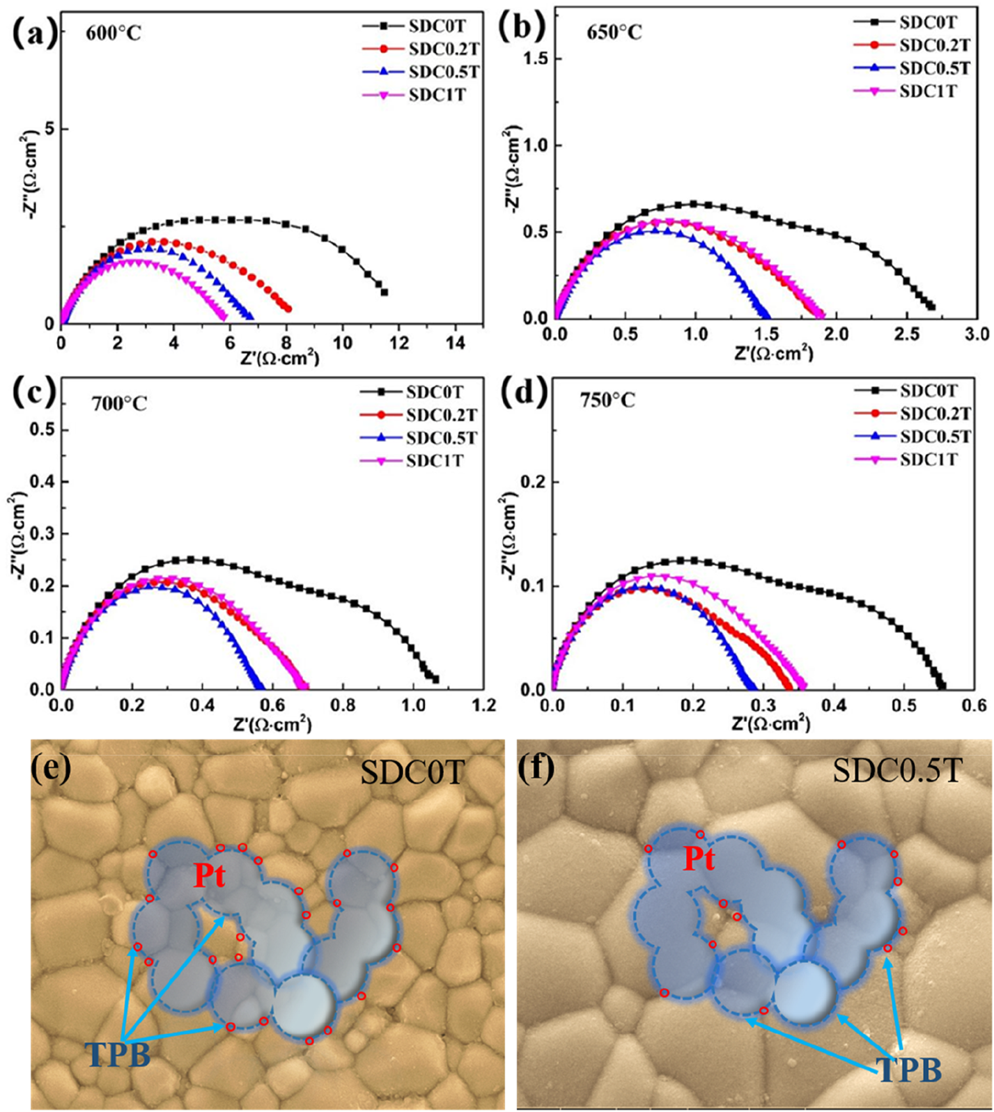 (A–D) Nyquist plots of the impedance spectra of the Pt electrodes. (E–F) Schematic diagram of the three-phase boundary of the Pt electrode reacting with oxygen at SDC-0T and SDC-0.5T electrolyte surface.