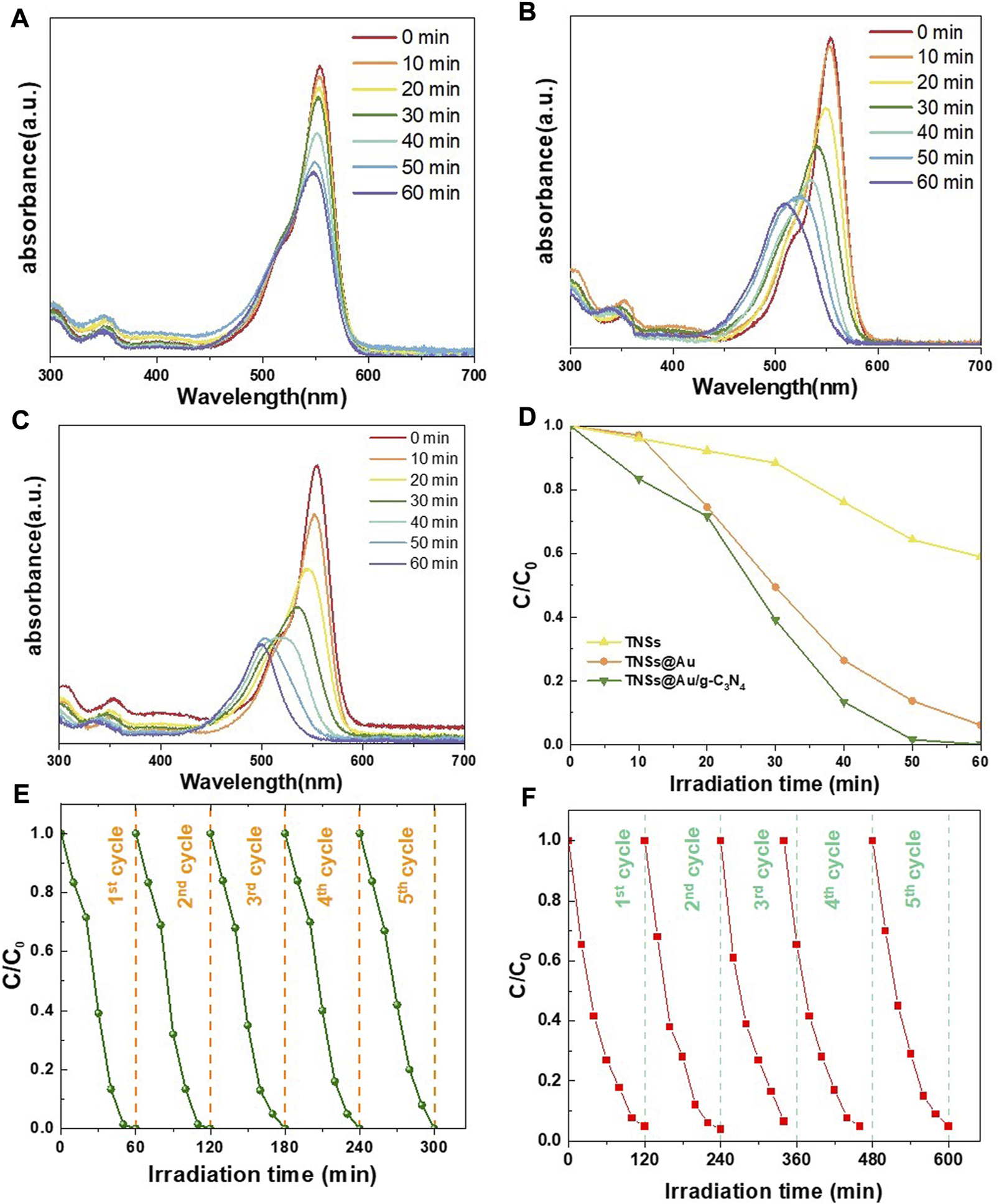 RhB aqueous solution's absorption spectrum degradation when exposed to (A) TNSs, (B) TNSs@Au, and (C) TNSs@Au/g-C3N4 based on the visible light irradiation time; (D) RhB photocatalytic degradation comparison under prepared catalysts; (E and F) Recycled photocatalytic degradation of RhB and MO.