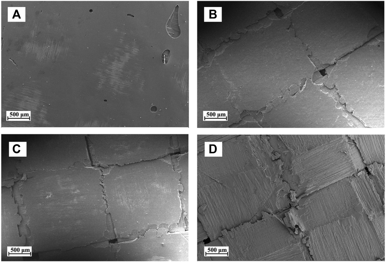 Surface morphology of the CFRP laminates treated under different temperatures: (A) original CFRP laminates, (B) 80°C, (C) 100°C, and (D) 140°C.