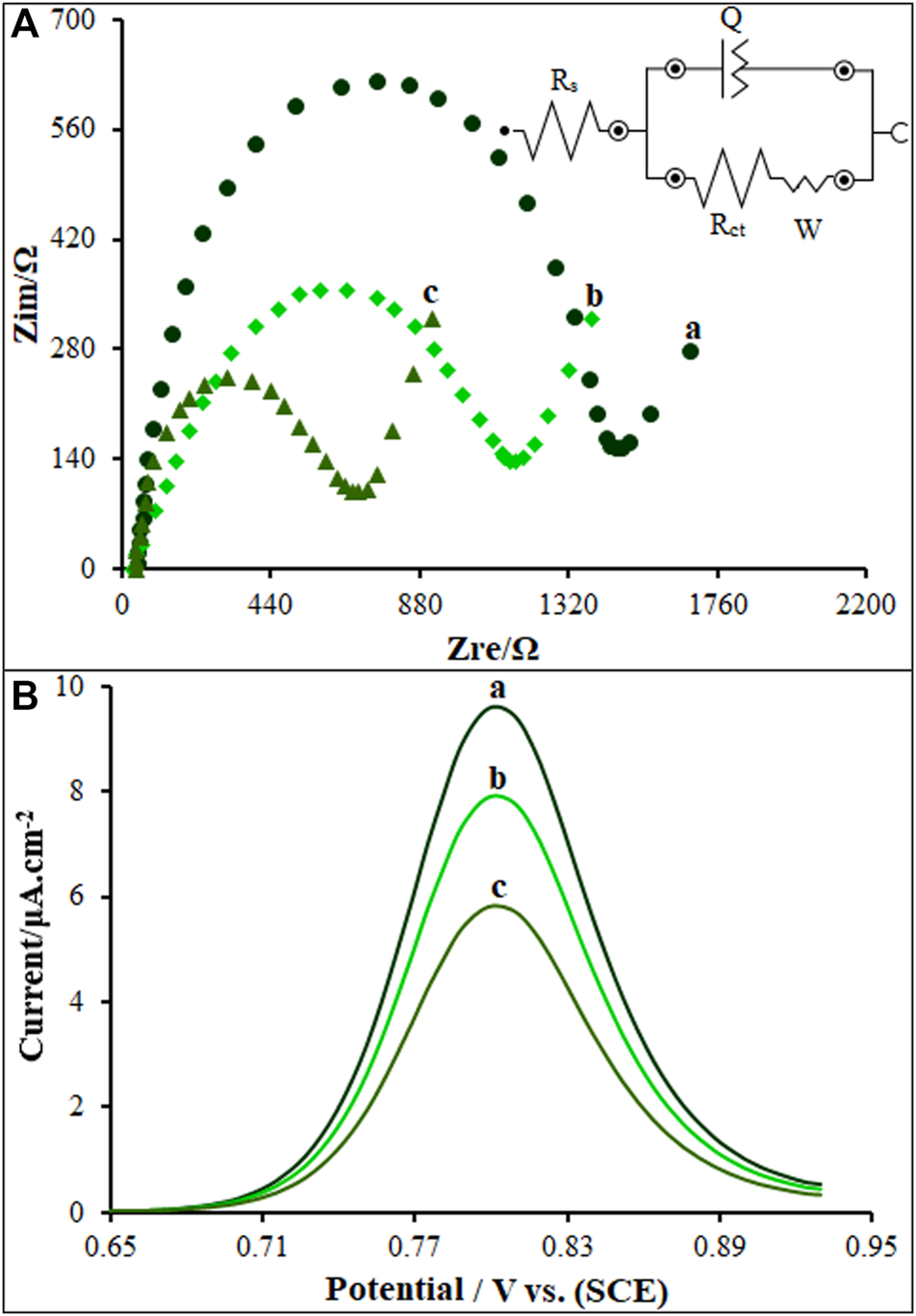 The modified electrode was assessed for the electrochemical behaviors by the EIS (Figure 5A) in 1.0 mmol/L [Fe(CN)6]3-/4-/0.1 M KCl electrolyte, in comparison to unmodified SPE, PP/P-L CuO NS/SPE and PP/P-L CuO:Tb3+ NS/SPE. The charge-transfer resistance (Rct) was estimated at approximately 1,482 Ω for the SPE according to Nyquist diagram. In the identical experimental circumstances, there was a reduction in the semicircle diameter on the PP/P-L CuO:Tb3+ NS/SPE and PP/P-L CuO NS/SPE, with the Rct values of approximately 660 and 1,143 Ω. Anchoring PP/P-L CuO:Tb3+ NS on the SPE surface caused an increase in electrical conductivity of electrode surface and a decrease in mass-transfer resistance during the redox process.
