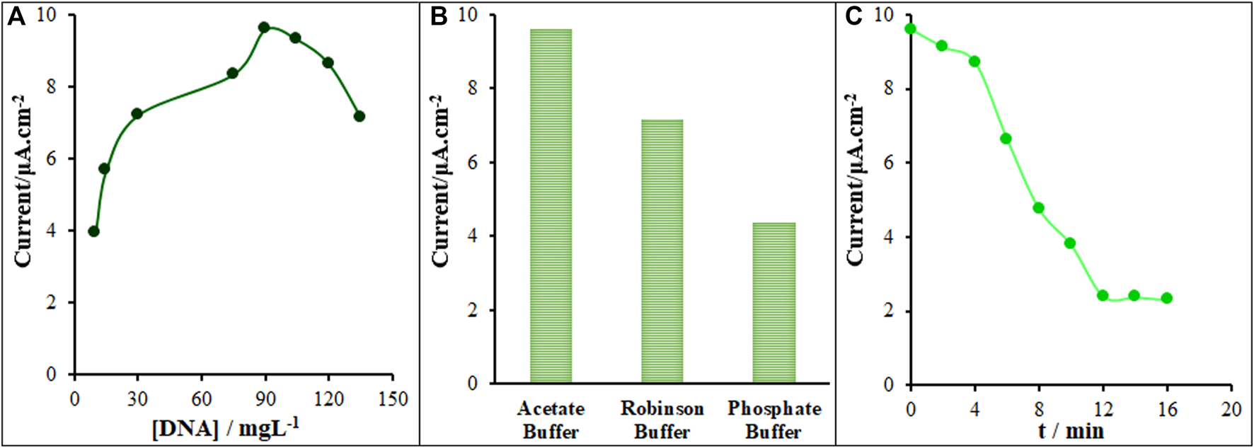 FIGURE 6. (A) Current versus ds-DNA concentration (10.0, 15.0, 30.0, 75.0, 90.0, 105.0, 120.0 and 135.0 mg/L) plot (B) Current recorded on ds-DNA/PP/P-L CuO:Tb3+ NS/SPE vs type of buffer at optimum condition (90.0 mg/L ds-DNA) (C) Effect of the time duration of 350.0 µM Vincristine on the guanine oxidation signal recorded on ds-DNA/PP/P-L CuO:Tb3+ NS/SPE (n = 5).