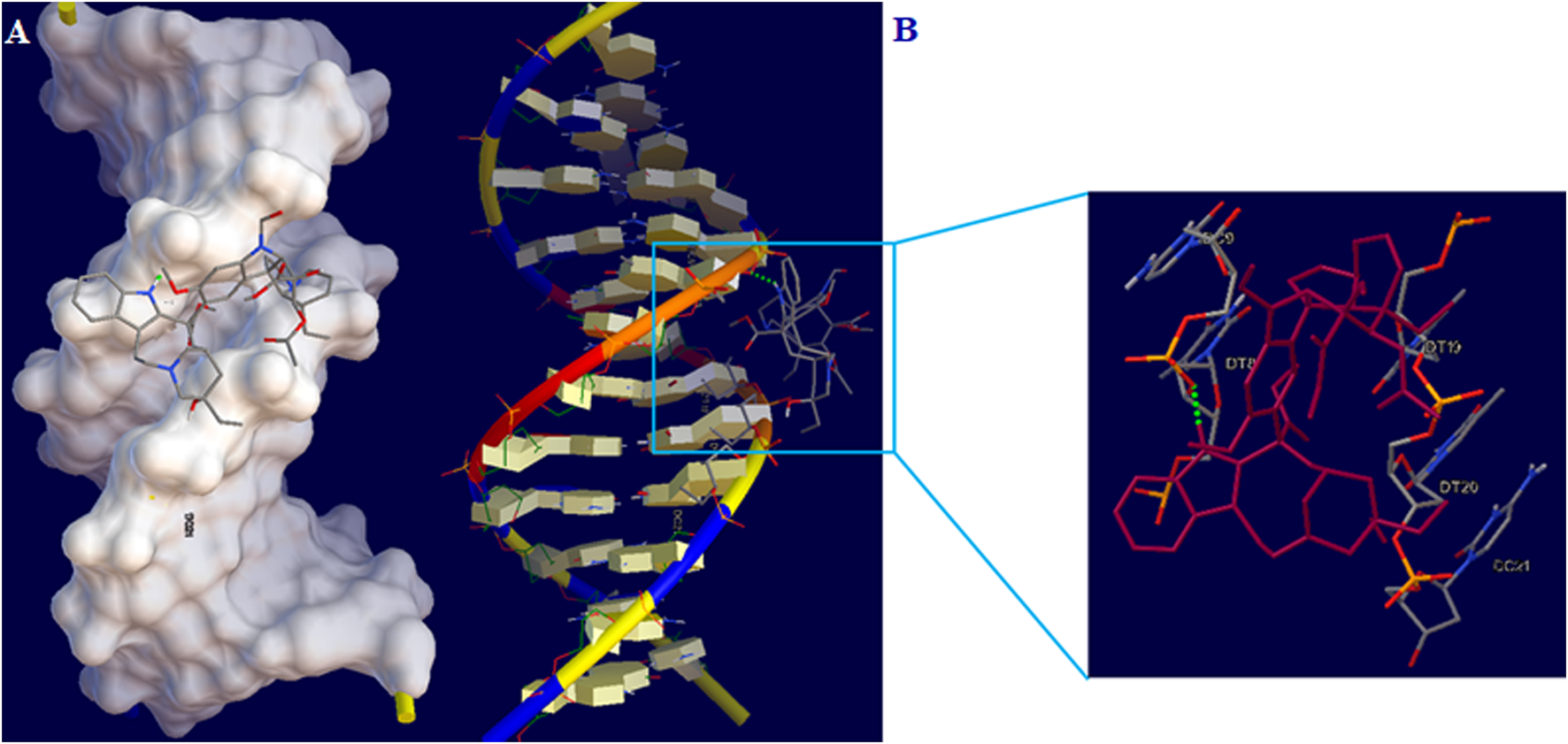 FIGURE 9. (A) Vincristine-DNA minor groove interaction (B) Geometrical disposition of vincristine in DNA minor groove.