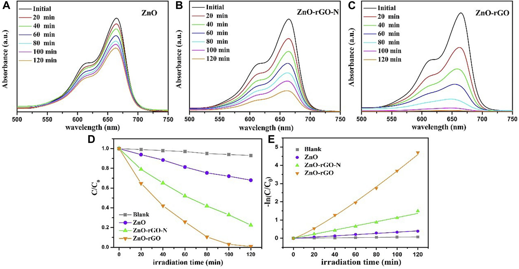The changes of UV-vis spectra of dye degraded by ZnO (A), ZnO-rGO-N (B) and ZnO-rGO (C) composites as interval illumination times, variation ratios of the concentrations of the MB degraded by different catalysts versus irradiation time (D), and the corresponding kinetic curves (E).