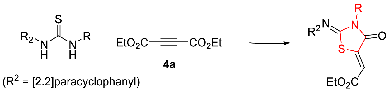 A new series of pyrimidine-bearing thiazolidinones (Scaffold B, 5a-l) was synthesized by refluxing thioureas 3a-f with acetylenedicarboxylate derivatives 4a,b in methanol for 4–6 h in 76–85% yields. The spectral and elemental data revealed that all 5a-l derivatives underwent the reaction smoothly to give the respective 2,4-dioxo-1,2,3,4-tetrahydro-pyrimidin-5-yl)imino)-4-oxo-3-substituted thiazolidin-5-ylidene)-acetates.