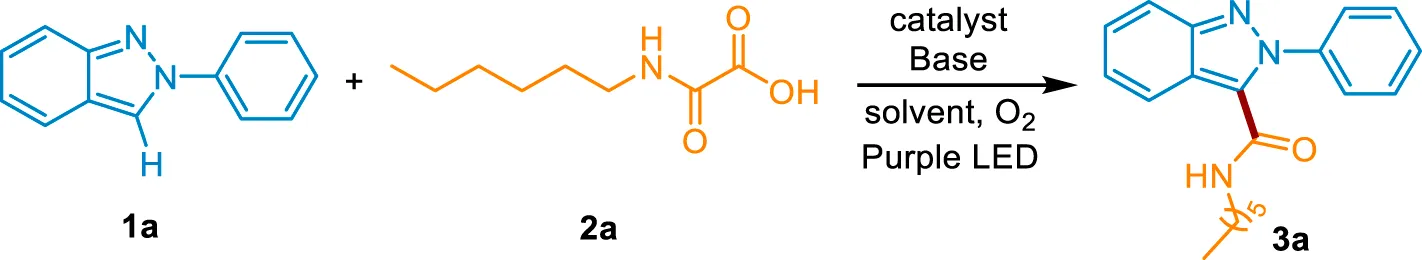 We chose 2-phenyl-2H-indazole (1a) and 2-(hexylamino)-2-oxoacetic acid (2a) as model substrates to investigate the decarboxylative C (sp2)-C (sp2) coupling reaction under 405 nm purple LED irradiation at room temperature. Consistent with the expected, when 4CzIPN was used as the photocatalyst and Cs2CO3 as the base, 1a and 2a could be converted into the carbamoylated 2H-indazole 3a in 56% yield under O2 atmosphere (Table 1, entry 1). Other transition metal-free photocatalysts including Rhodamine B, Rhodamine 6G, Fluorescein, Na2-Eosin Y, and Rose bengal were catalytically inactive, with no product detected (Table 1, entries 2–6). Then, a systematic survey of bases were conducted. The results indicated that replacing Cs2CO3 with other inorganic bases (Na2CO3, K2CO3, LiOH, KOH, CsOH) or organic bases (Et3N, DIPEA, TMEDA, DABCO) decreases the formation of the desired product (Table 1, entries 7–15). A range of solvents, such as, DCM, MeCN, DMF, DMAC, NMP, THF, DMC, EG, and H2O were screened (Table 1, entries 16–24). We found that DMSO is superior in this process. Increasing the amount of 2a to 2.5 equiv. improved the yield to 74% (Table 1, entry 25). Because the insoluble residue existed in the reaction system, the volume of DMSO was increased to 3 ml, along with the generation of products in 91% yield (Table 1, entry 26). In the absence of visible light or photocatalyst, no product was detected, which confirms the photochemical nature of this method (Table 1, entries 27–28). The reaction was completely inhibited in the absence of Cs2CO3, indicating the essential role of the base in the transformation (Table 1, entry 29). Taken together, the optimal reaction conditions were established as follows: 1a (0.2 mmol), 2a (2.5 equiv), 4CzIPN (5 mol%) as a catalyst, Cs2CO3 (2 equiv) as a base, DMSO (3 ml) as a solvent, at 35°C under O2 atmosphere and the irradiation of purple LED (λmax = 405 nm) for 12 h.